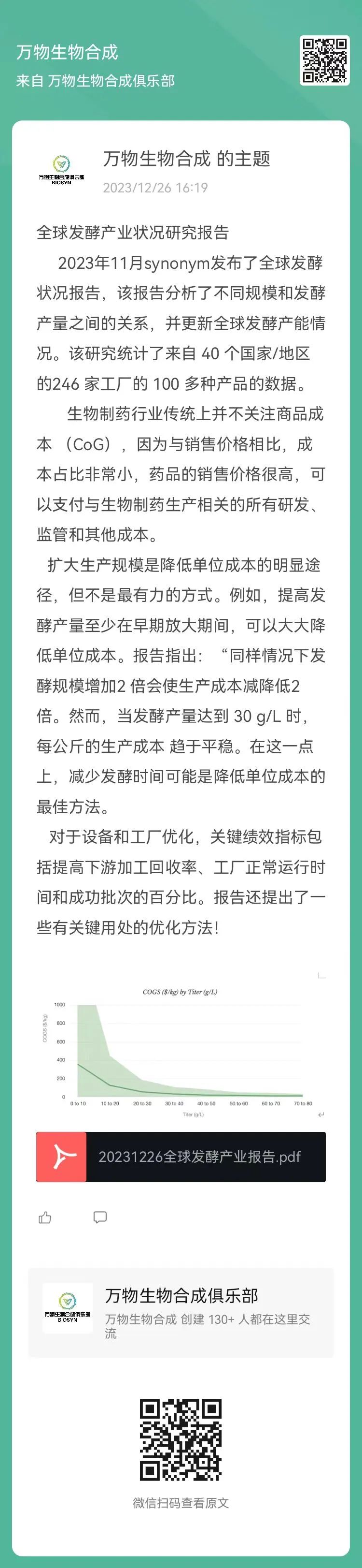 2023年11月synonym发布了全球发酵状况报告,该报告分析了不同规模和发酵产量之间的关系,并更新全球发酵产能情况。该研究统计了来自 40 个国家/地区的246 家工厂的 100 多种产品的数据。