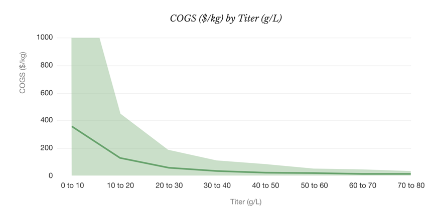 扩大生产规模是降低单位成本的明显途径,但不是最有力的方式。例如,提高发酵产量至少在早期放大期间,可以大大降低单位成本。报告指出:“同样情况下发酵规模增加2 倍会使生产成本减降低2 倍。然而,当发酵产量达到 30 g/L 时,每公斤的生产成本 趋于平稳。在这一点上,减少发酵时间可能是降低单位成本的最佳方法。