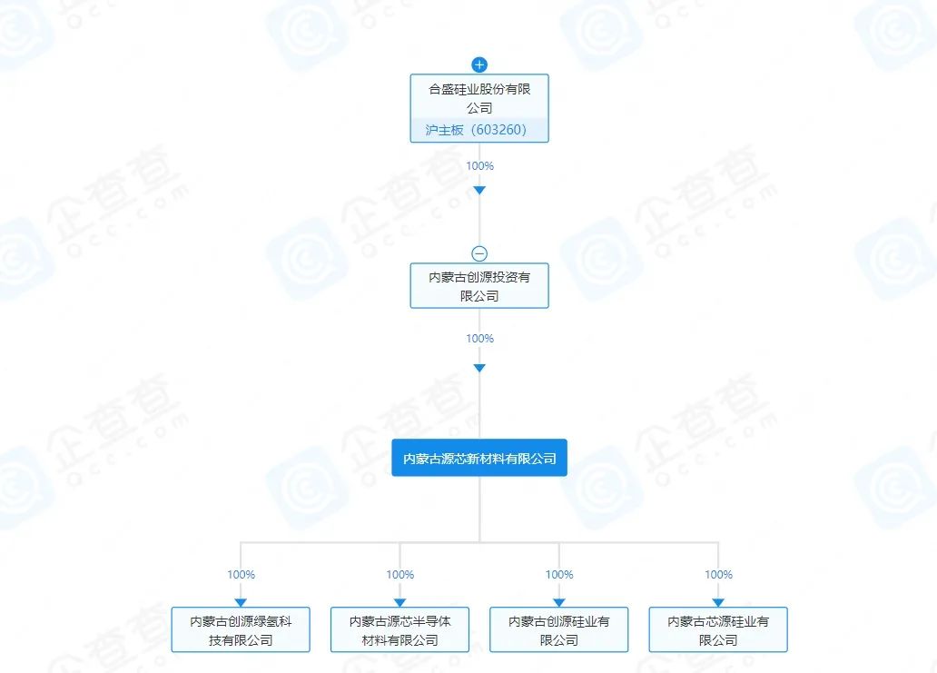 全球氢能经天眼查App获悉,1月23日,内蒙古创源硅业有限公司成立,法定代表人为陈继霖,注册资本1亿人民币,经营范围含电子专用材料制造、销售,非金属矿物制品制造、销售,气体、液体分离及纯净设备制造;站用加氢及储氢设施销售;节能管理服务;在线能源监测技术研发等。股权全景穿透图显示,该公司由内蒙古源芯新材料有限公司全资持股,后者由“中国硅王”合盛硅业(603260)间接全资持股。