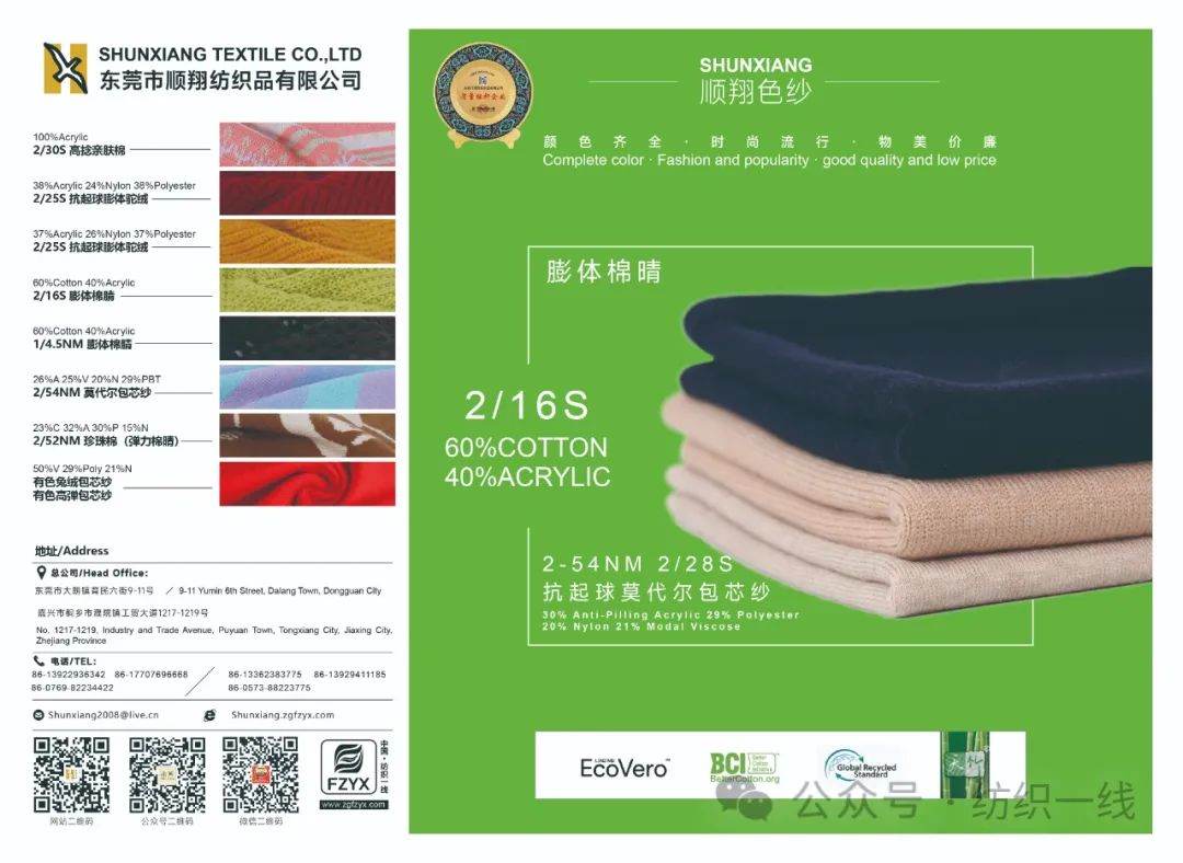 东莞市顺翔纺织有限公司,成立于2004年,总公司坐落于中国羊毛衫名镇/大朗镇富华北路112号,分公司浙江省桐乡濮院工贸大道1217-1219号.顺翔纺织投资研发有纺厂.染厂,摇纱 打毛厂,拼纱厂,是一集研发,生产,染整,产业链仓储式销售于一体的毛织纱线制造商。我们以优良的品质,服务,信誉为理念,服务于国内外中高端服装毛衫品牌.