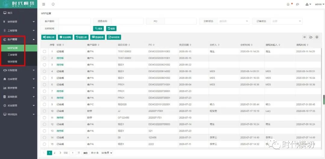 1.支持物料需求(MRP)计算。PMC可以对订单一键进行物料需求计算。借助于仓库模块强大的二维码实时库存管理,PMC可以一键计算出一个订单中所有产品的所有原材料需要请购的面积,并下推给采购部门,效率极大提高。