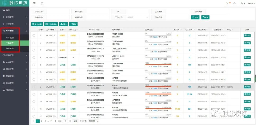 2. 支持工单生产进度查看、以及工单的领料、补料、退料、品检、良品数、损耗率等自动统计。