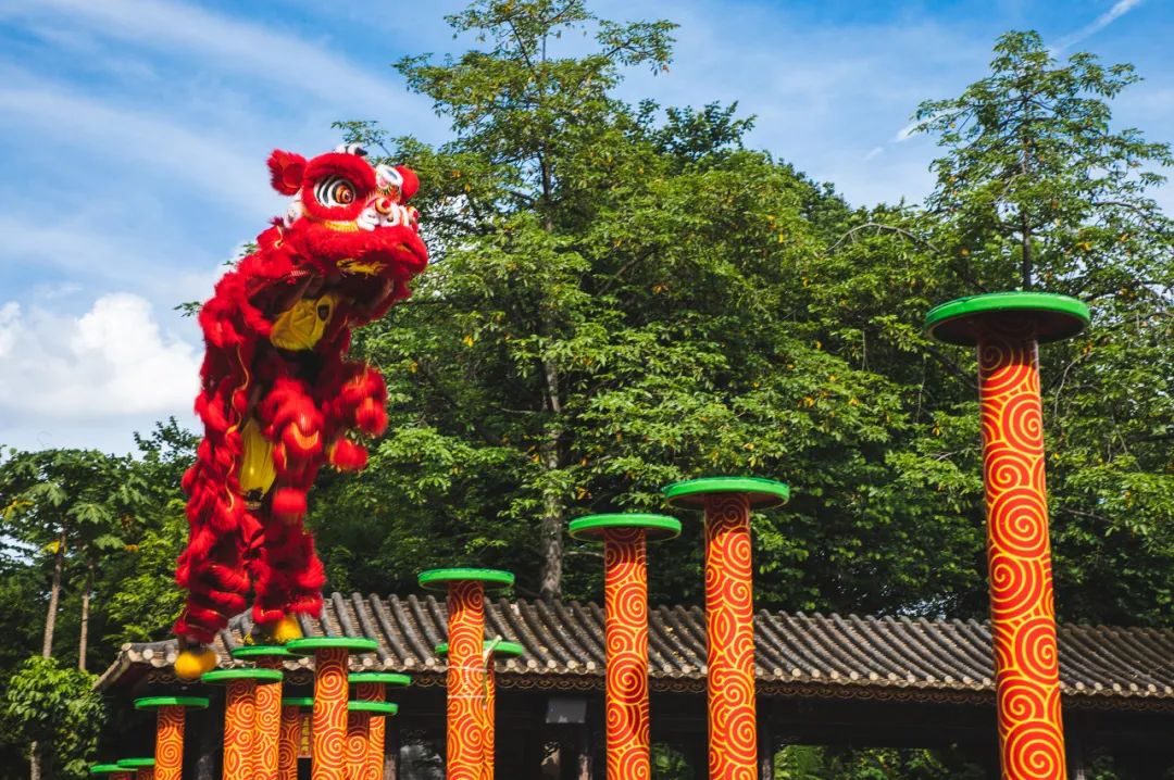 舞狮子始于魏晋,盛于唐,又称“狮子舞”、“太平乐”,一般由三人完成,二人装扮成狮子,一人充当狮头,一人充当狮身和后脚,另一人当引狮人。舞法上又有文武之分,文舞表现狮子的温驯,有抖毛、打滚等动作;武狮表现狮子的凶猛,有腾跃、蹬高、滚彩球等动作。