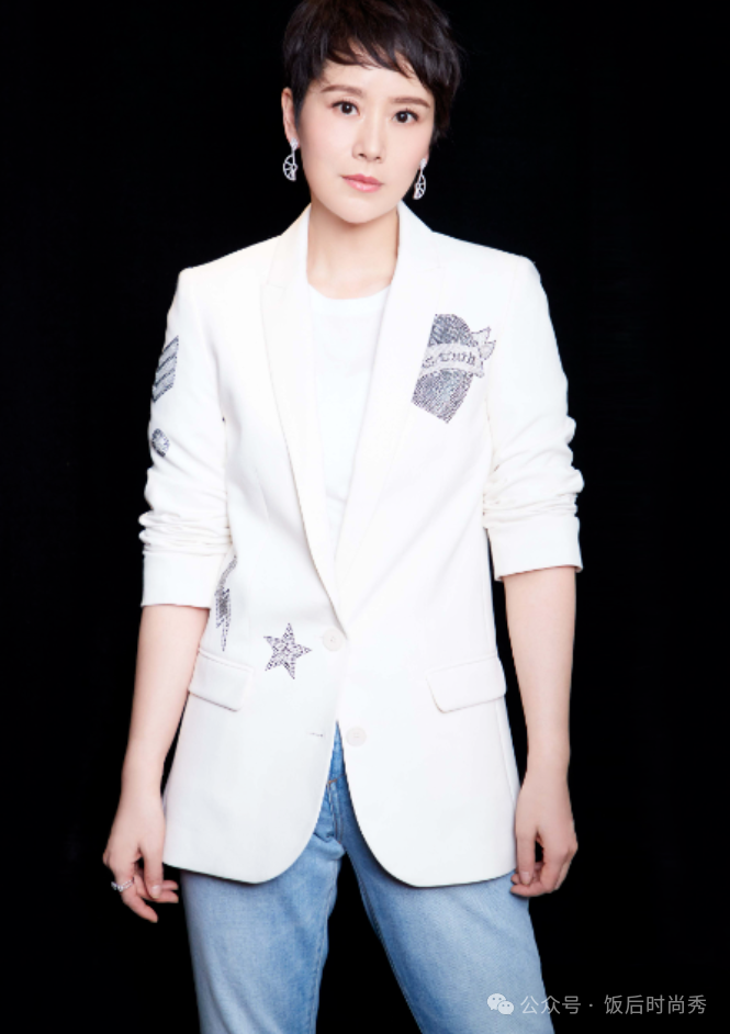 另一套装扮则是白色印花西装外套搭配浅蓝色修身牛仔裤,展示了一种轻松自在的商务休闲风。银白色的戒指和耳坠作为点缀,为整体造型增添了几分都市的精致感。这种穿搭不仅展现了她的时尚品位,还彰显了她的气质和个性。