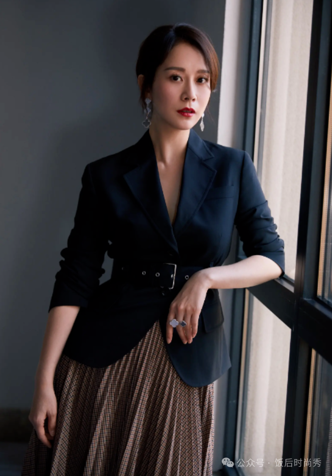让我们更深入地了解海清的几款商务风格装扮,每一套都散发着她独特的时尚魅力。海清穿搭黑色不规则西装搭配褐色不规则半身裙,这种组合打破了传统商务装的严肃感,增添了时尚的氛围。配以蓝色耳坠和黑色腰带,更加突显了她的个性与魅力。