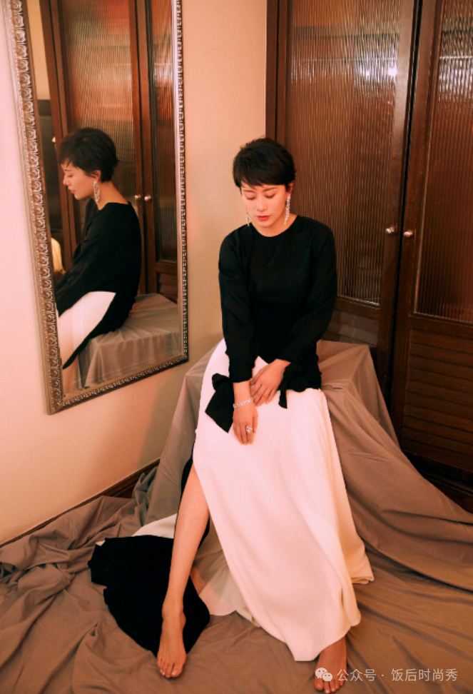 海清还选择了黑色毛衣搭配白色开叉半身裙,经典的黑白搭配展现出了她的优雅与力量。配以银白色流苏耳坠、手链和戒指,整体造型既简约又不失时尚感。这种穿搭不仅适合日常工作,还能够应对重要会议,展现出女性的自信和魅力。
