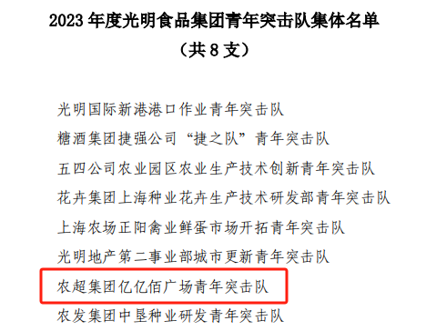 近日,2023年度光明食品集团职业青年岗位建功行动表彰结果揭晓,经创建申报、资格审查、互访学习、民主评议,农超集团亿亿佰广场青年突击队荣获“2023年度光明食品集团青年突击队”称号。