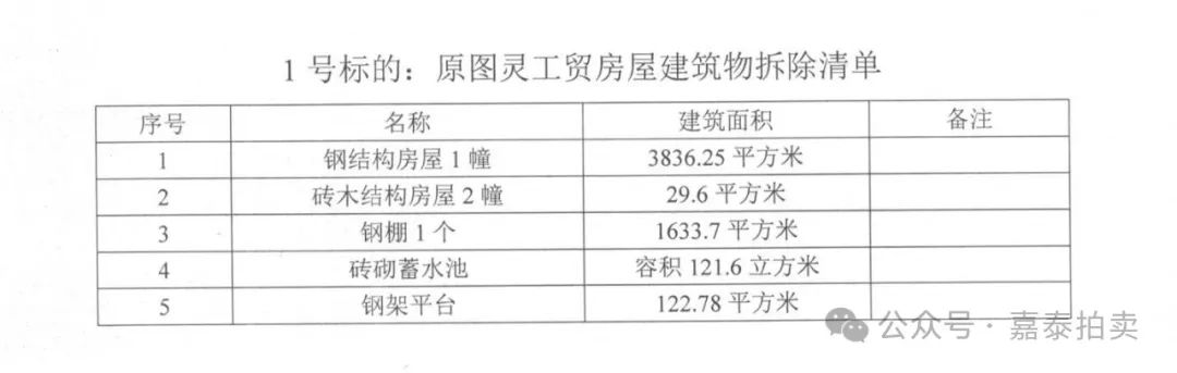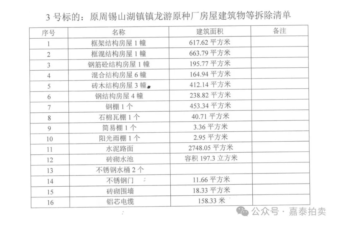 3、位于龙游县湖镇镇新建村(原周锡山湖镇镇龙游原种场)厂房拆除工程,拆除建筑物面积约3020.23平方米,另有水泥路面约2748.05平方米,起拍价2.5万元,竞买保证金1万元。