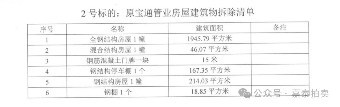 2、位于龙游县湖镇镇沙田湖工业区(原宝通管业)厂房拆除工程,拆除建筑物面积约2392.09平方米(拆除范围详见清单),起拍价12万元,竞买保证金2万元。