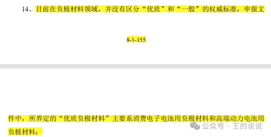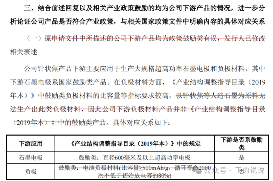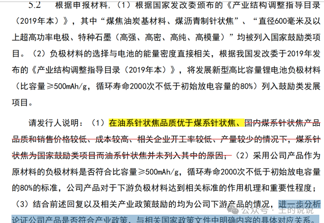小,且目录制定时国内负极材料产量较少,其主要原材料油系针状焦当时的关注度较低以公司产品作为原材料的负极材料系人造石墨,人造石墨的理论克容量为372mAh/g,达不到比容量≥500mAh/g的标准。以公司产品作为原材料的负极材料,能够满足循环寿命2,000次不低于初始放电容量的80%的标准。因此,以公司产品为原料生产的负极材料并非《产业结构调整指导目录(2019年本)》中鼓励类产品。