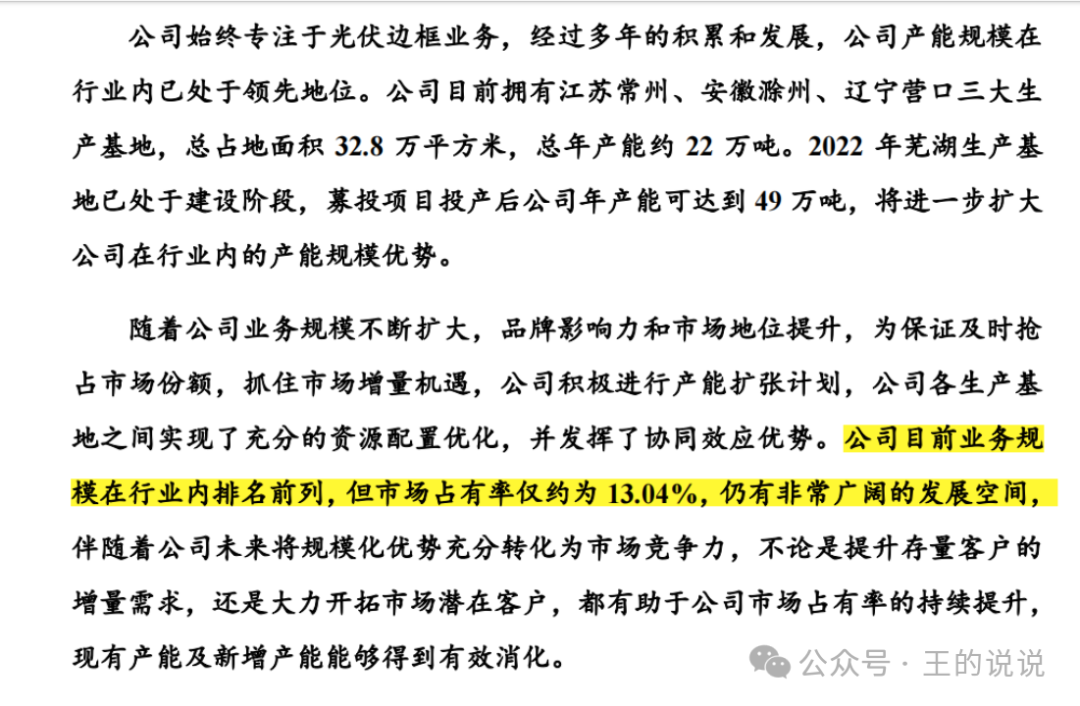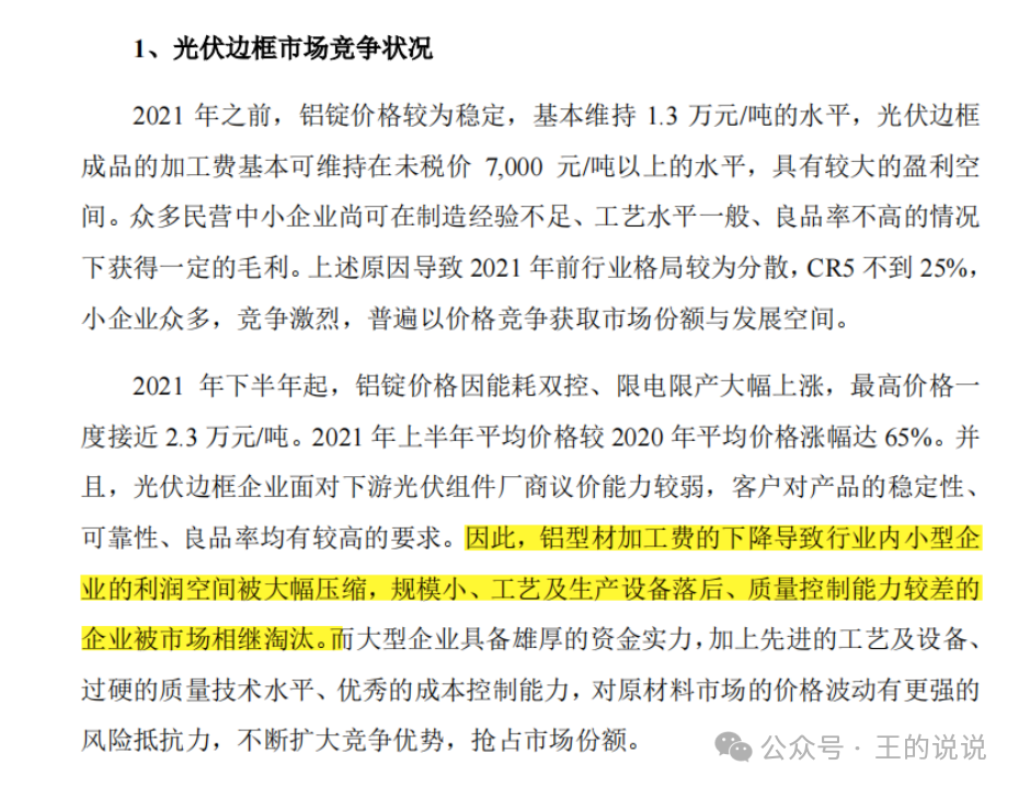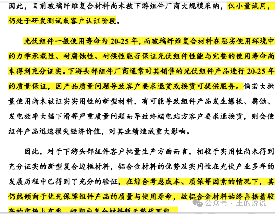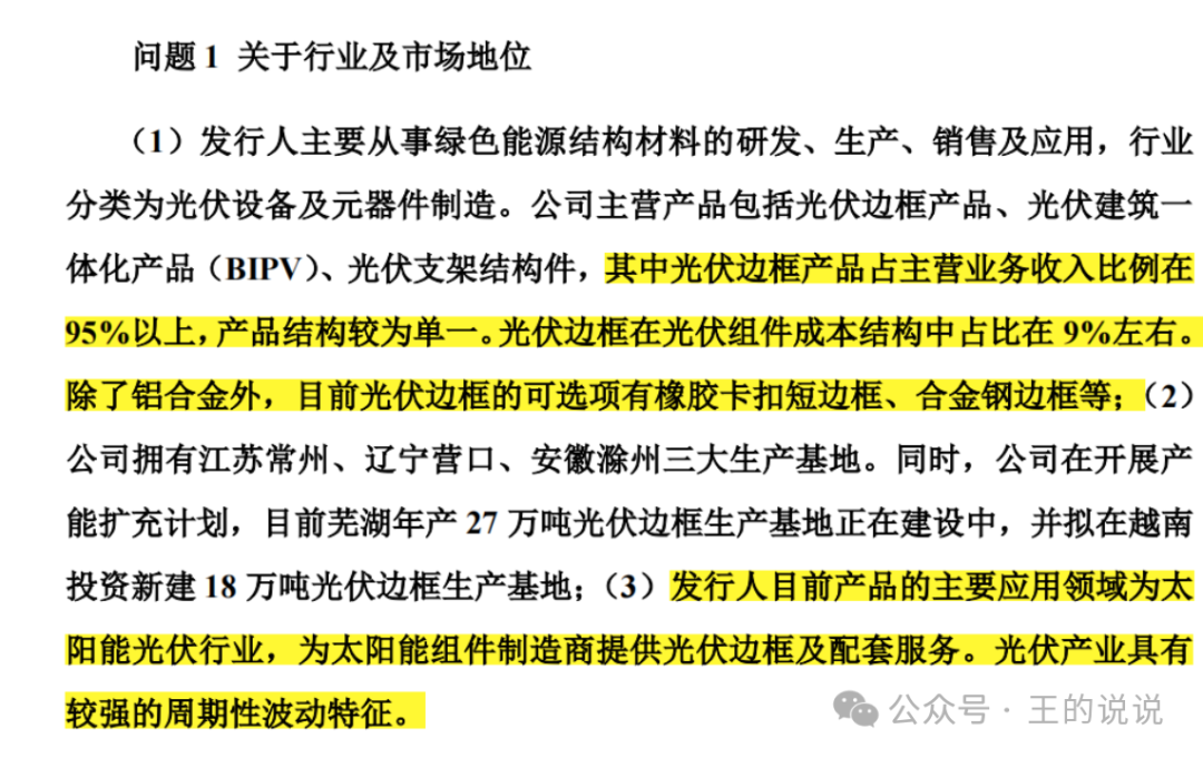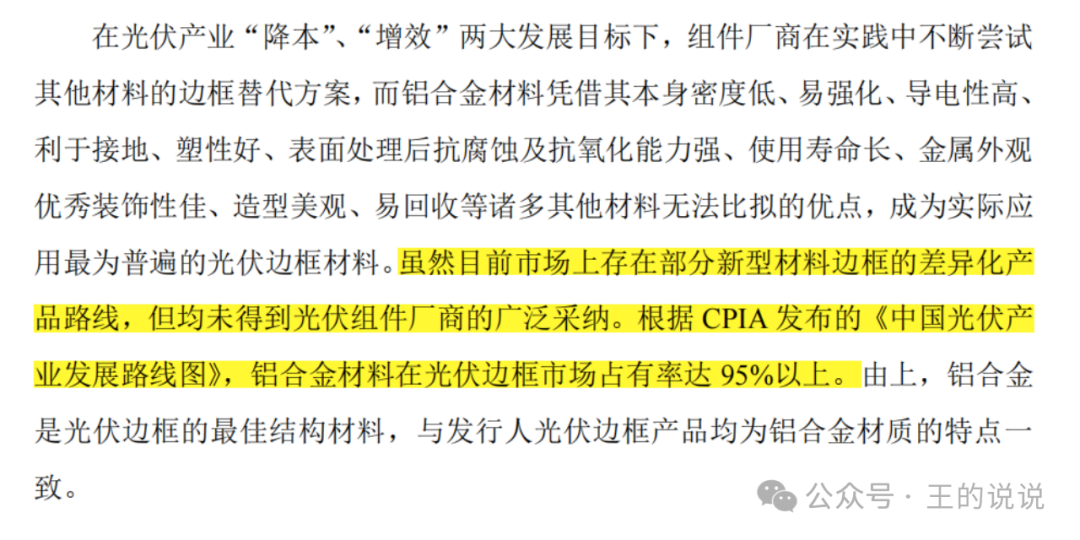 关于行业及市场地位-你只生产这一种铝合金光伏边框产品,在整个大产品中成本占比9%,还有其他材质也能做光伏边框产品。。