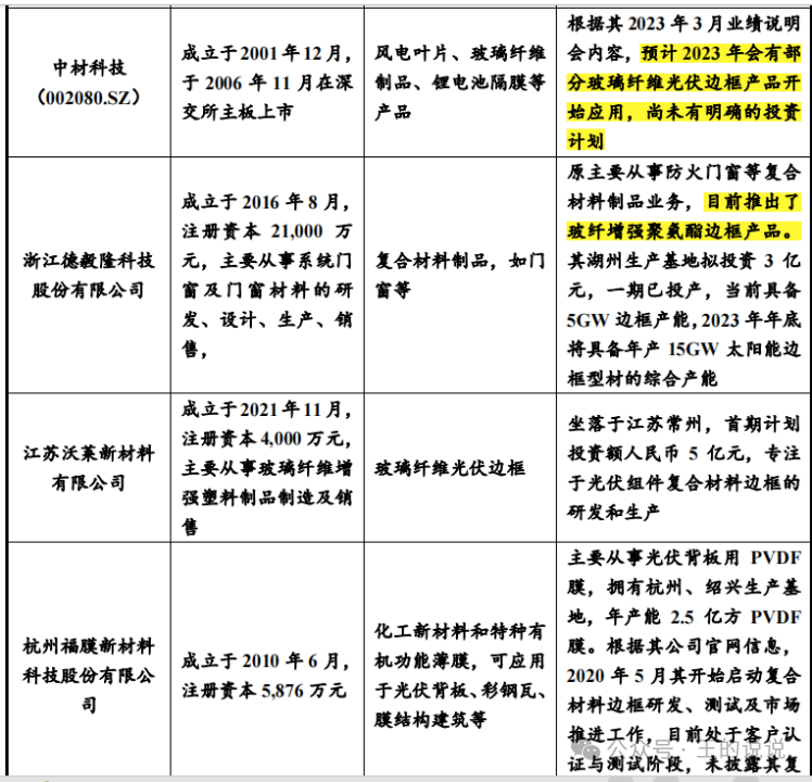 目前行业内少数厂商正在探索新型复合材料边框,与上述橡胶卡扣材质的 复合材料不同,新型产品主要以聚氨酯及玻璃纤维作为边框材料。以下为行业内部分探索新型复合材料边框企业的基本情况: