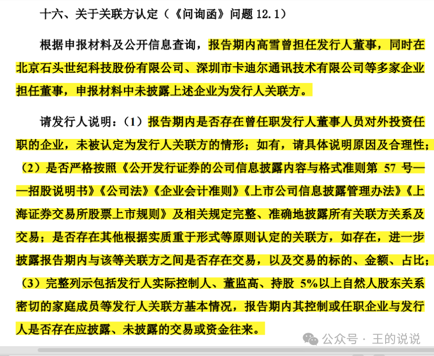 根据申报材料及公开信息查询,报告期内高雪曾担任发行人董事,同时在北京石头世纪科技股份有限公司、深圳市卡迪尔通讯技术有限公司等多家企业担任董事,申报材料中未披露上述企业为发行人关联方。