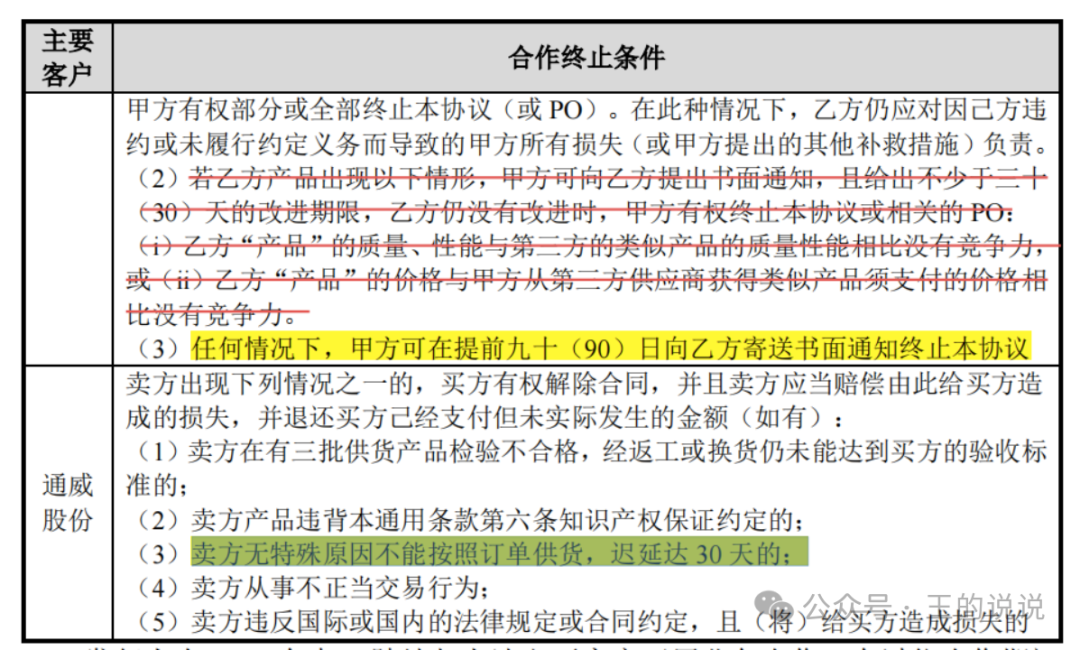 )任何情况下,甲方可在提前九十(90)日向乙方寄送书面通知终止本协议。卖方无特殊原因不能按照订单供货,迟延达 30 天的;