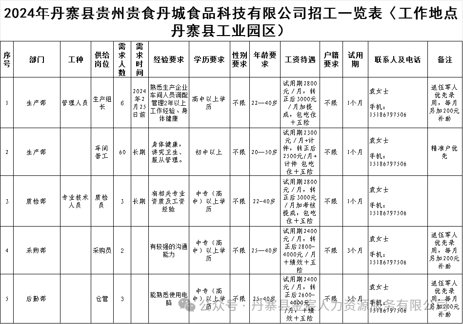 【县内招聘】2024年丹寨县贵州贵食丹城食品科技有限公司招聘