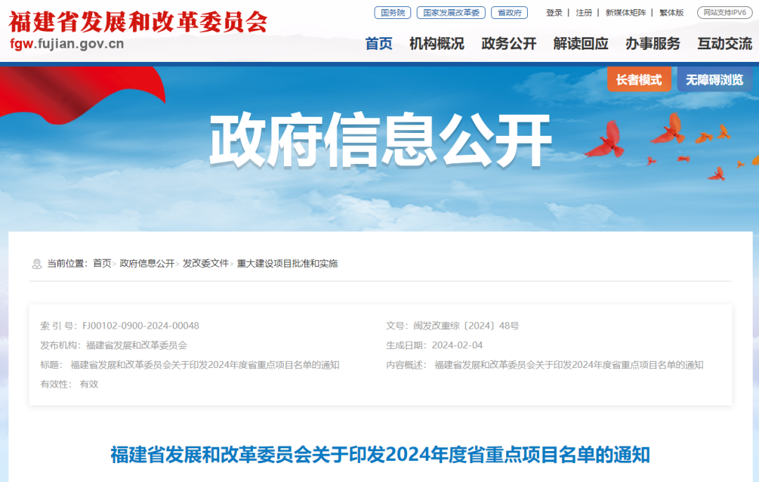 近日,福建省发改委公布了2024年度省重点项目名单,经省政府同意,确定2024年度省重点项目1593个,总投资4.28万亿元,年度计划投资6807亿元。