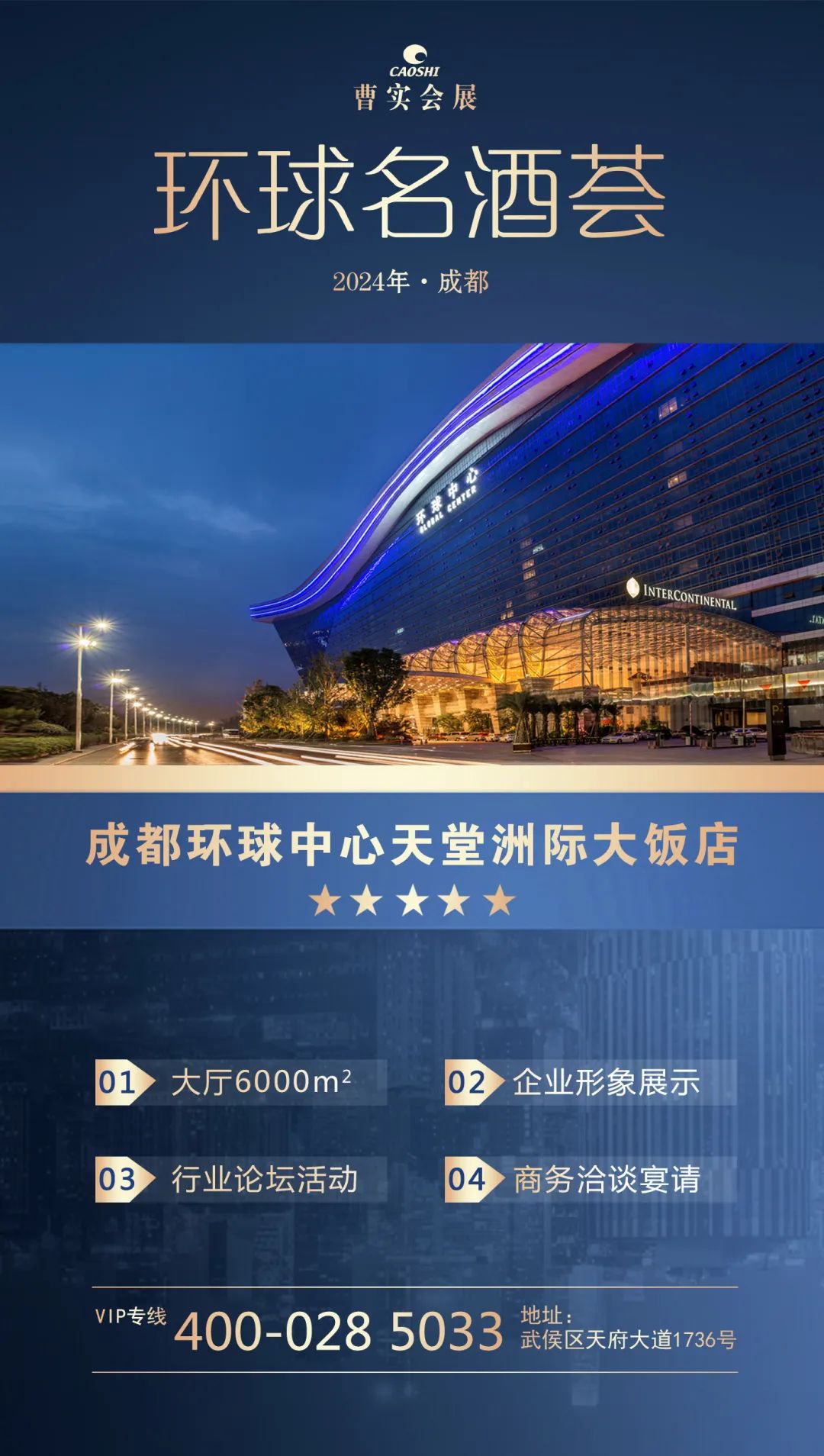 成都环球中心天堂洲际大饭店坐落于世界最大的单体建筑——环球中心,酒店档次高、容纳量大,展厅面积近10000平米,房间975间,1200平米宴会厅,可以同时满足企业布展、发布会/论坛活动、经销商接待的需求。