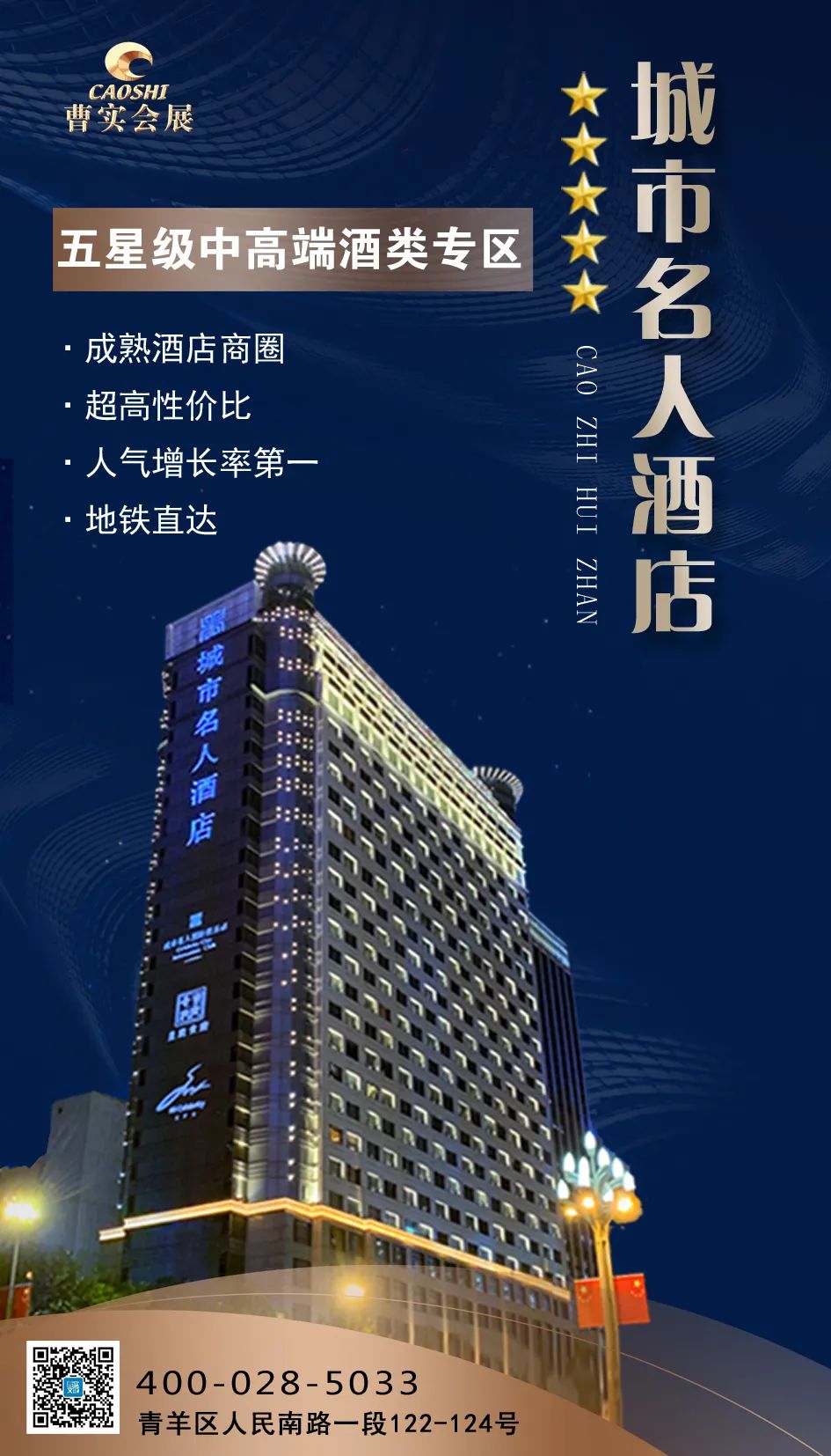 城市名人酒店位于锦江宾馆、岷山饭店、大成宾馆等酒水布展酒店集群核心区域,是最早设立酱酒专馆、拥有产区协会背书、品牌和产品最全面的酒店之一。酒店布展总面积共计8000余平方米,布展房间300间,酒店总容纳量越600余家酒企,已形成规模、质量效应。