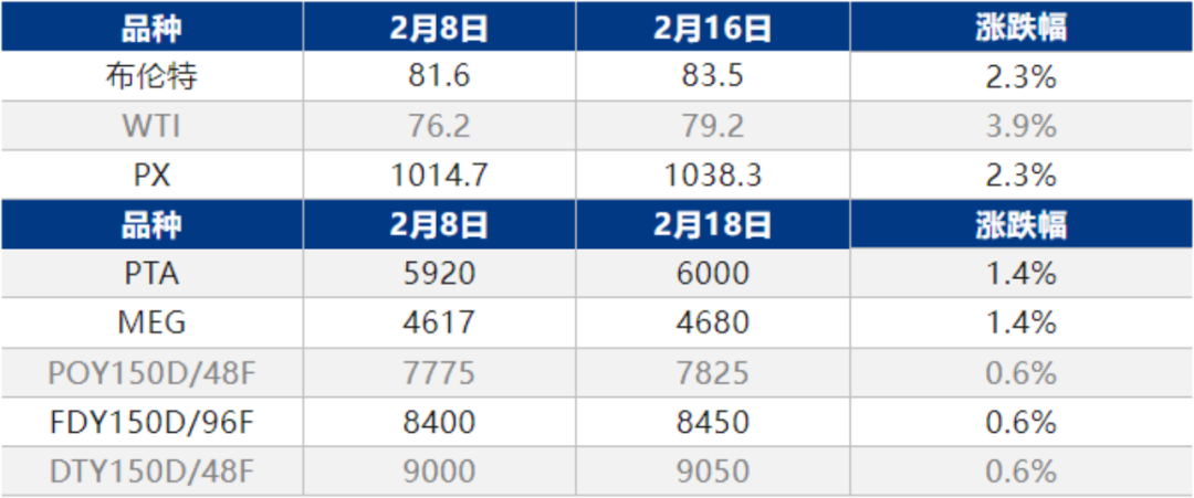 春节假期,国际原油价格出现了普遍上涨,布伦特原油期货9天时间上涨了4.02美元,涨幅为5.42%,纽约原油期货上涨了3.98美元,涨幅为5%。而在原油的带动下,作为PTA原料的PX外盘价格也从1020美元上涨到了1038美元,涨幅为1.8%。成本端支撑下,涤纶长丝节后市场商谈重心同步上扬。
