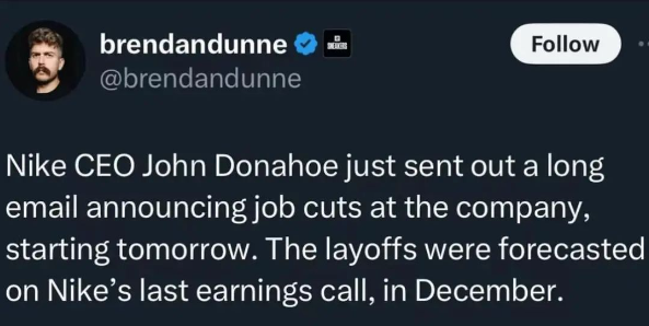 事实上,在去年12月21日的财报电话会议上,耐克高层就已经透露了裁员的计划。在当天针对2024财年第二季度财报的电话会议上,John Donahoe表示,耐克公司正在寻找机会,在未来三年内累计节省高达20亿美元的成本,潜在节省成本的领域包括简化产品分类、提高自动化程度和技术使用、精简组织以及利用公司规模来提高效率。