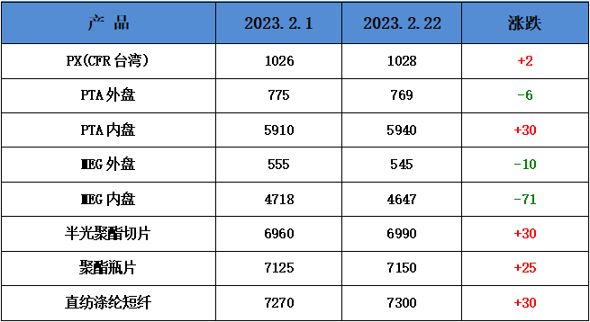 聚酯方面:春节期间国际油价明显上涨。一方面是地缘局势仍在持续不断的升温,中东、俄乌、红海等局势相互交织在一起,对石油供应有着严重的威胁;另一方面则是美国失业率处于3.7%的历史最低水平,这或将不断推迟降息的可能,也意味着经济保持着强劲的一面,有利的支撑着油价继续上涨。截至周四(2月23日)收盘,纽约商品交易所4月交货的轻质原油期货价格上涨70美分,收于每桶78.61美元,涨幅为0.90%;4月交货的伦敦布伦特原油期货价格上涨64美分,收于每桶83.67美元,涨幅为0.77%。