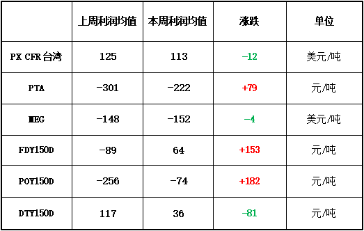 本周PX盈利较上周小幅回落,目前其盈利至113美元/吨。PTA方面,本周亏损有所减少,目前其亏损至222元/吨附近。乙二醇方面,本周亏损小幅增加,目前亏损152美元/吨。涤纶长丝方面,本周涤丝价格变化较大,利润有所增加,FDY150D反亏为赢,盈利64元/吨;POY 150D亏损减少,目前亏损74元/吨;DTY 150D盈利减少,目前盈利36元/吨。