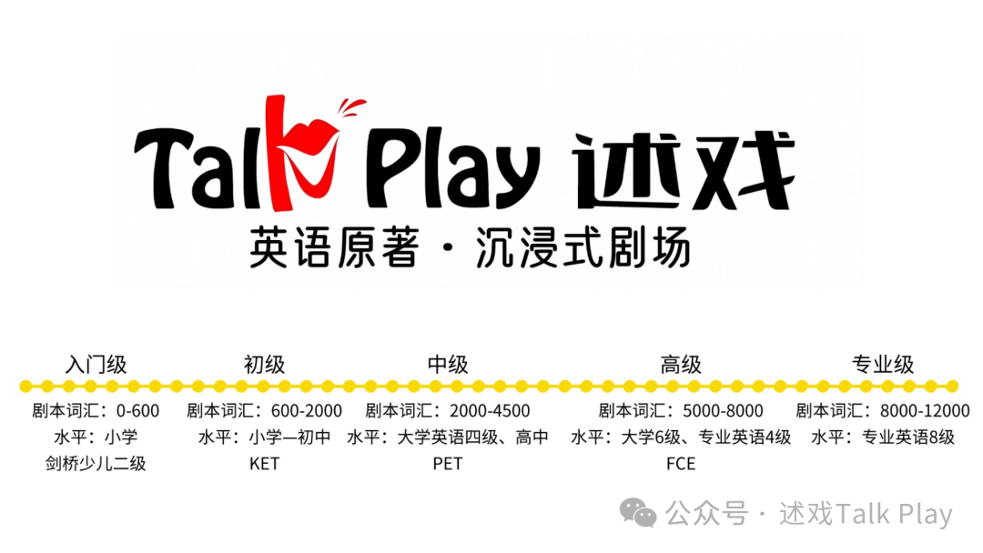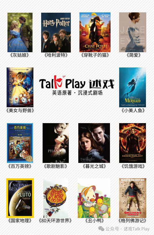 Talk Play述戏致力于寓教于乐,通过多样化、英语原著·沉浸式剧场趣味性、高互动、沉浸式的教学模式提升5-16岁孩子学习英文的能力。每个来到Talk Play 述戏的孩子,基本可以做到零基础—三年时间能听能读哈利波特这个难度级别的原版小说。仅需数周时间,家长便可以看到孩子能力具象化的改变,从不敢说、不能说,到可以全英文复述数数分钟的英文故事!