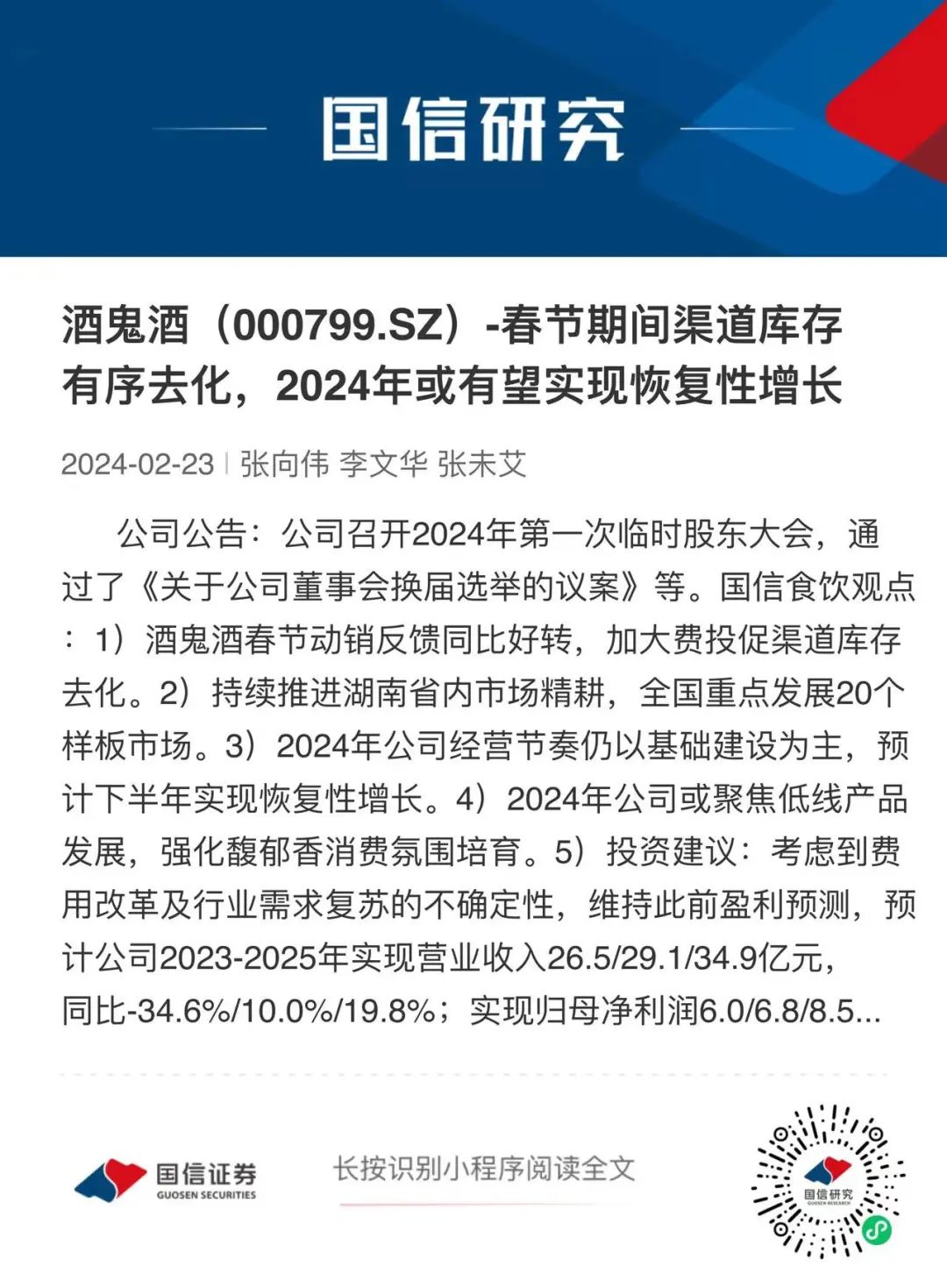 本文来源于2024年2月23日已发布的《酒鬼酒:春节期间渠道库存有序去化,2024年或有望实现恢复性增长》