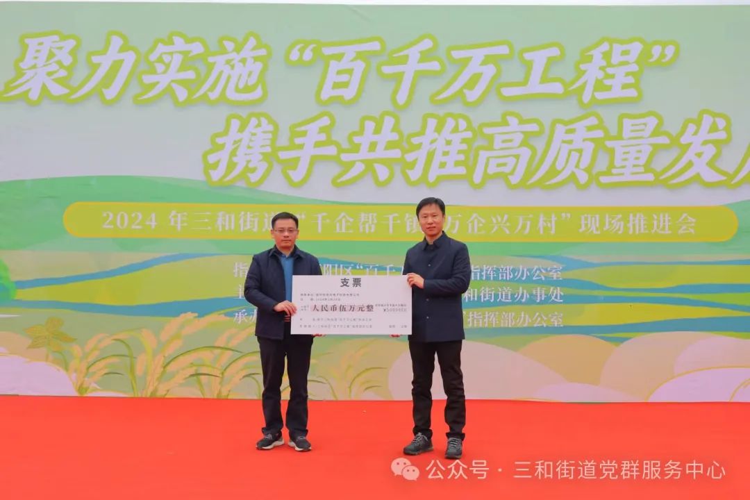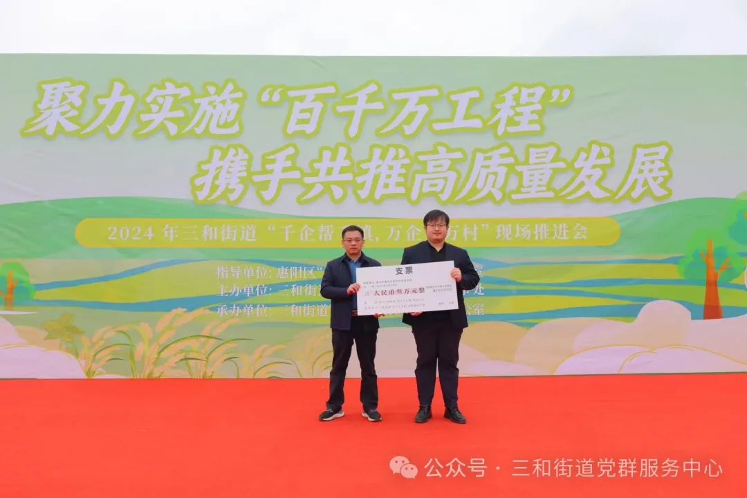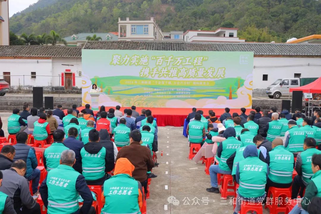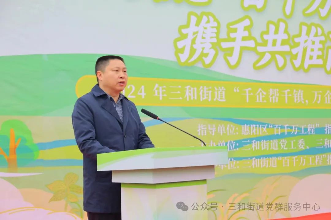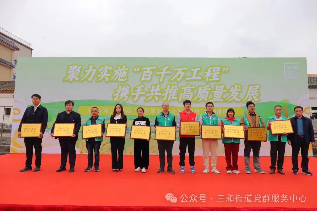 根据省、市、区“百县千镇万村高质量发展工程”的有关工作部署,2024年2月24日,三和街道在全坑村禾仓坑隆重举办“千企帮千镇,万企兴万村”现场推进会。区委常委、常务副区长王家荣出席会议,区百千万指挥部办公室、区农业农村和水利局以及三和街道全体领导班子、干部职工、企业代表、师生代表、党员代表和村组干部等参加会议。会议由三和街道党工委副书记、办事处主任石文锋主持。
