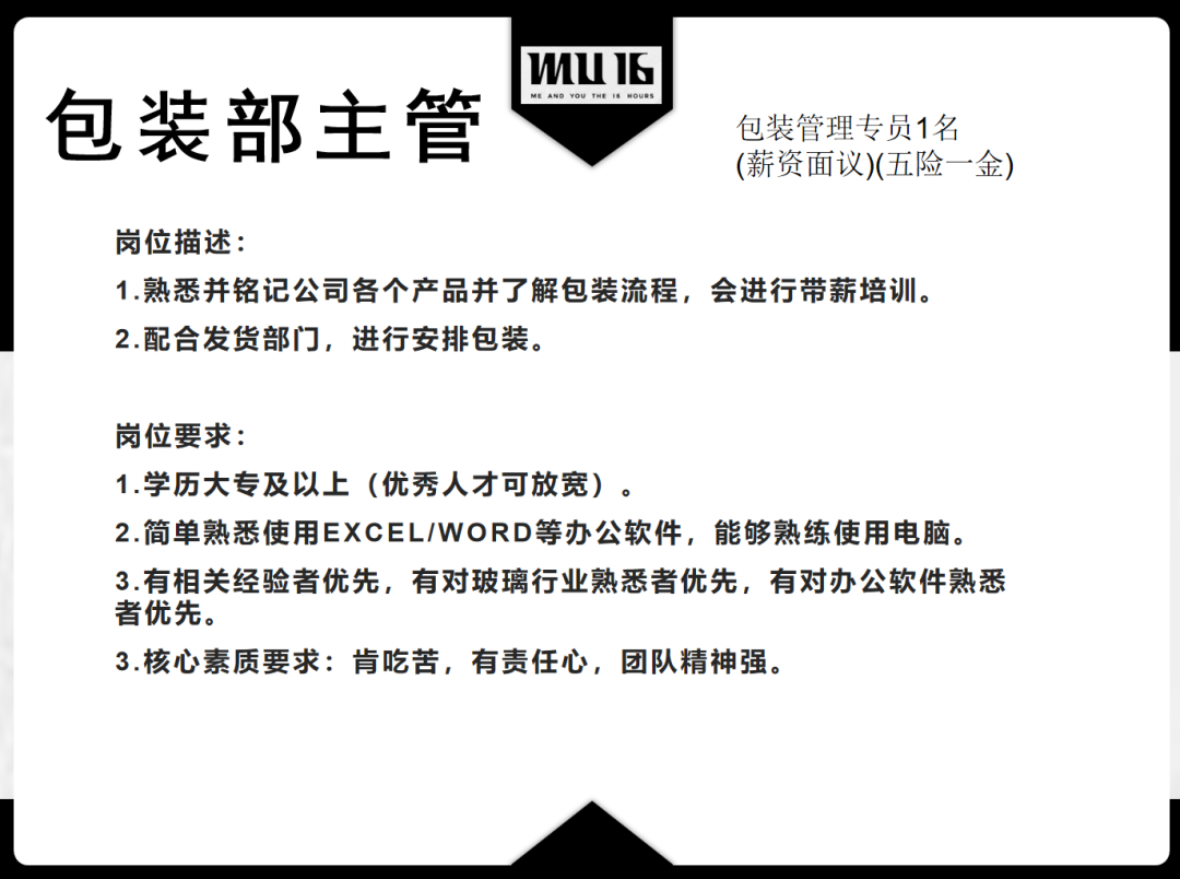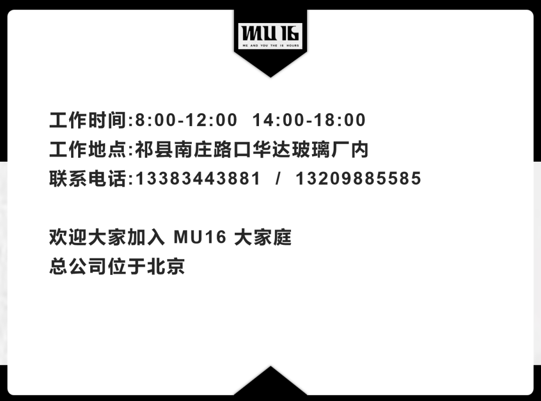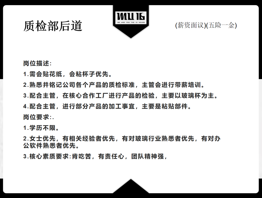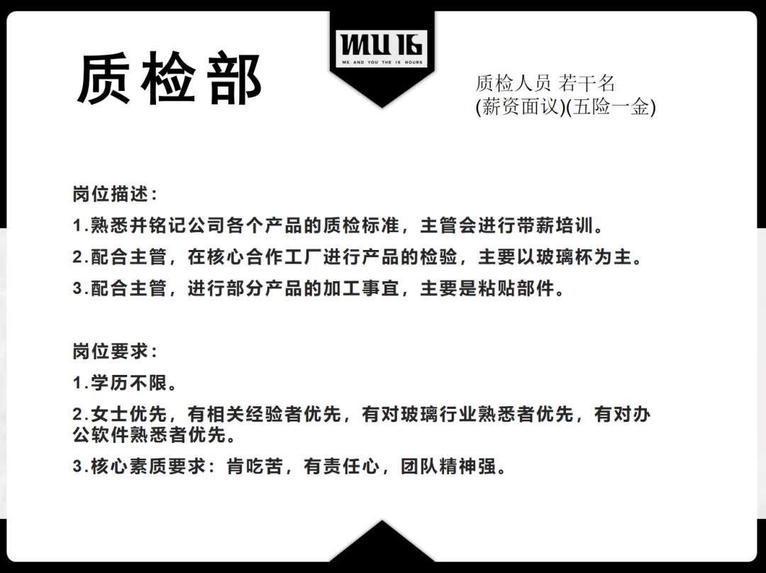 MU16供应链团队对外招聘诚聘:五险一金,待遇优厚,福利多多!!! MU16是立足于祁县的水晶器皿品牌,因业务扩大,现继续全面扩招 质检员两名以上,男女不限,有相关从业经验者优先,对办公软件熟悉者优先