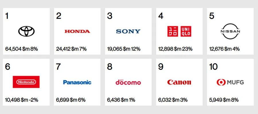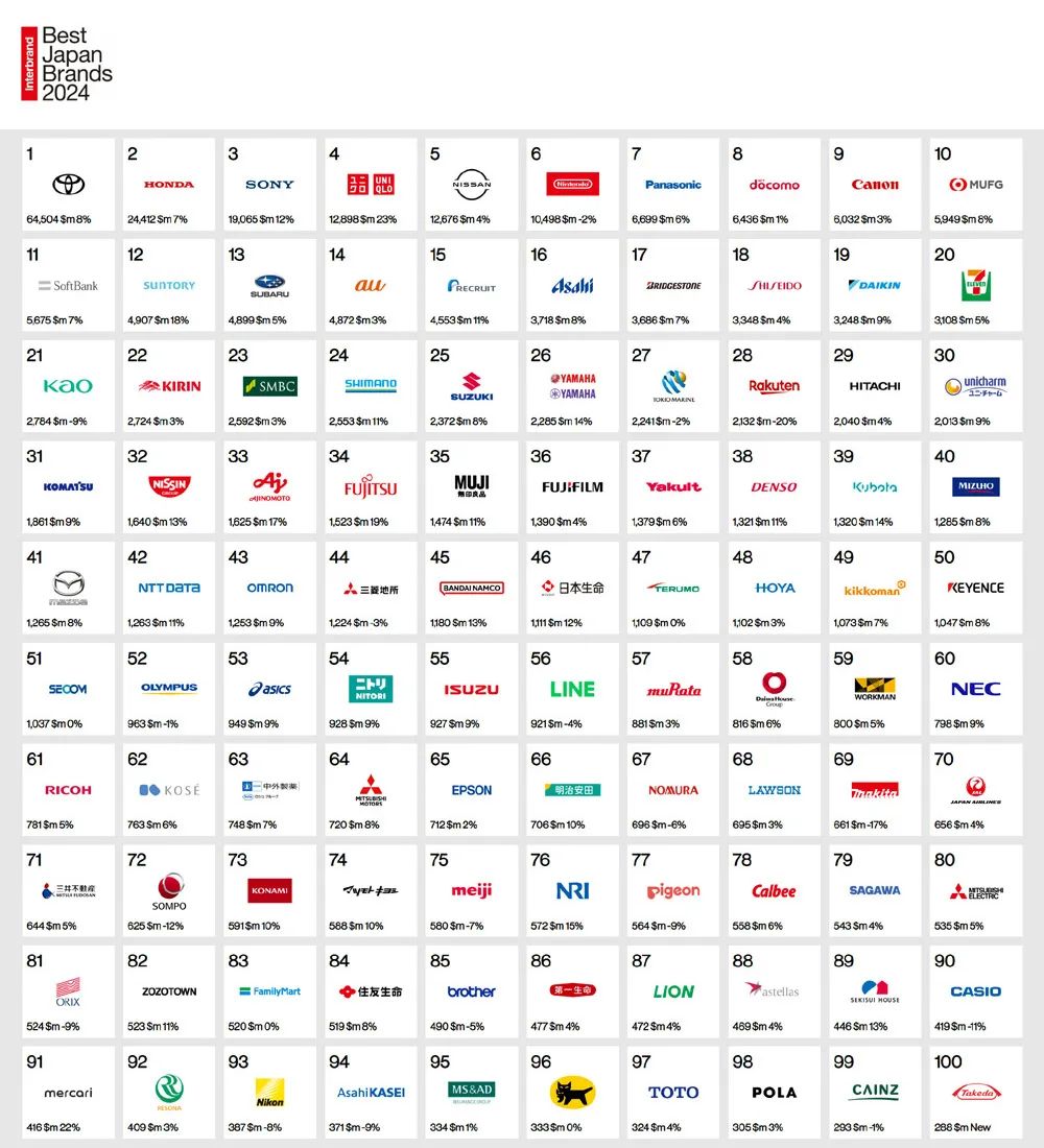 美国品牌咨询公司Interbrand旗下的Interbrand Japan公司发布2024年日本企业品牌价值排行榜(Best Japan Brands 2024)。“丰田”连续16年排在首位,品牌价值为645亿美元。“本田”和“索尼”依旧排在第二和第三位。“优衣库”的品牌价值同比增长23%,在日本企业中增长率最高。前100个品牌的合计价值为2916亿美元,同比增长6.7%。排名以日本企业创造的品牌等为对象。以今后5年左右的预期利润等为基础,把企业的品牌价值换算为金额。在此次日本国内企业调查中,更新了ESG(环境、社会、企业治理)等有关可持续发展的评估方法。