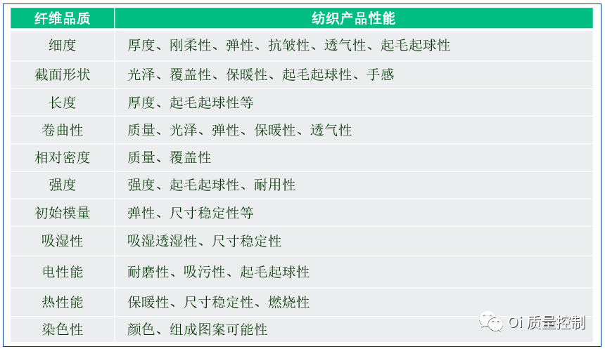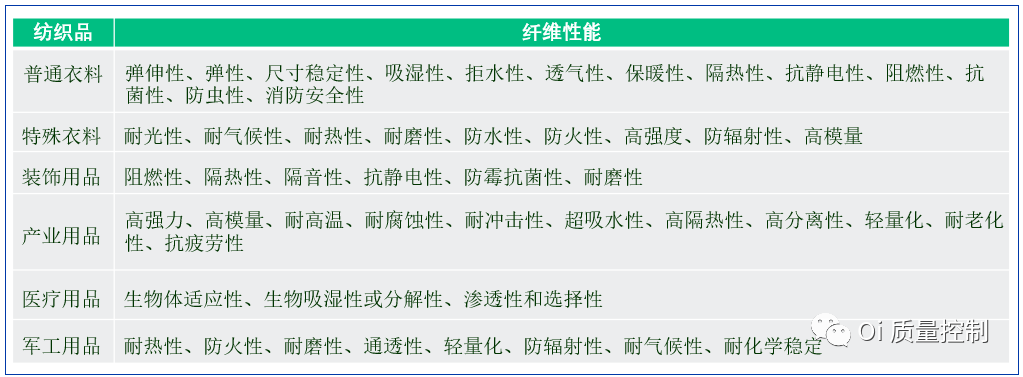 纤维与纺织产品的使用性能、审美特性和经济性之间存在着非常密切的关系,纤维对纺织品的使用性能起决定作用。不同用途的纺织品对纤维性能要求不同,如服用纺织品、装饰用纺织品、产业用纺织品要求各不相同,详见表。