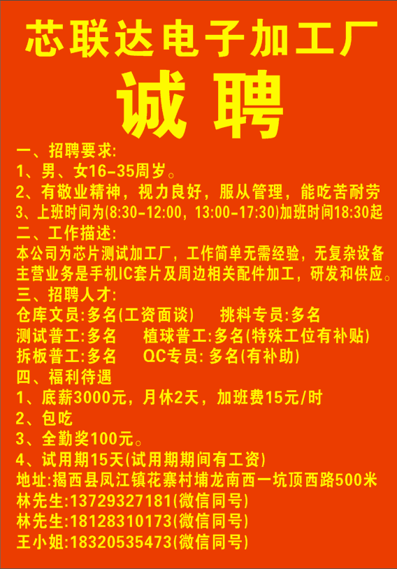 待遇:本公司吃住免费,工资按职位面谈,细节面议,希望有志之士加盟本公司。