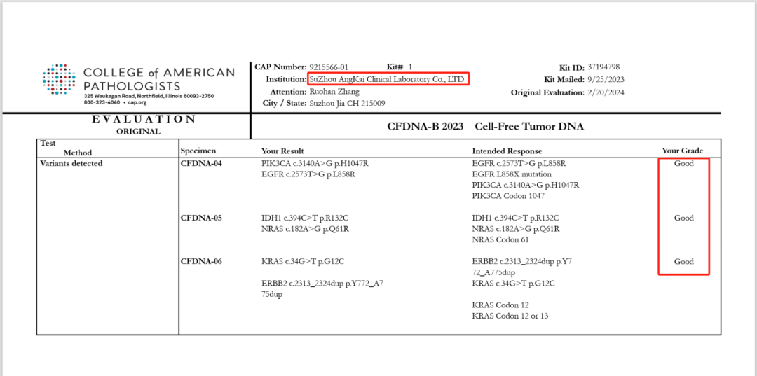 近日,美国病理学家协会(College of American Pathologists,CAP)公布了CFDNA-B 2023(Cell-Free Tumor DNA)能力验证项目成绩,昂凯医学以满分成绩通过此次室间质评,获得"Good"的好成绩。再次充分证明昂凯医学检测血液细胞游离DNA(cfDNA)的准确性、可靠性和规范性获得国际权威机构认可。