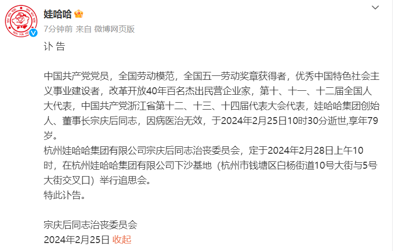 今天中午,娃哈哈官方发布讣告。