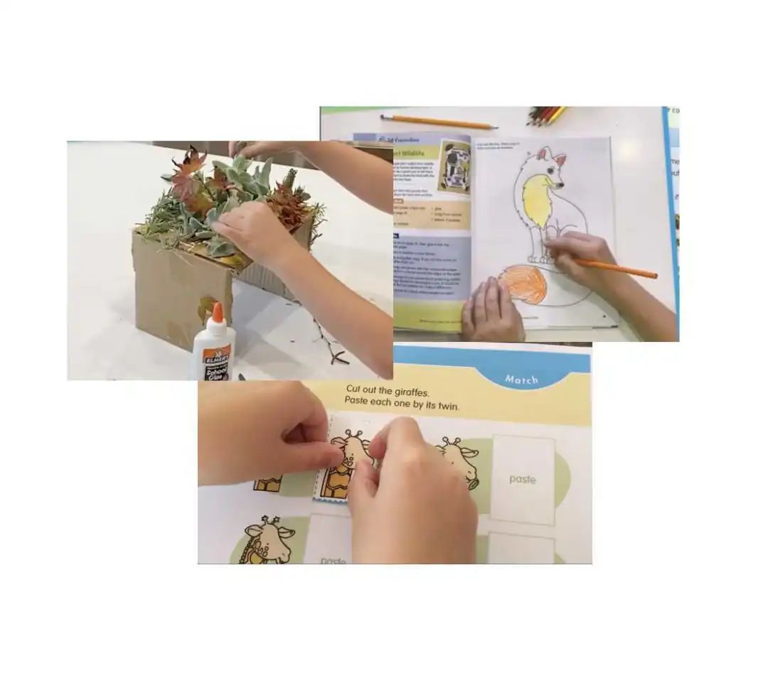 整个过程中,穿插着好玩的连线、涂色、配对、计数、区分等互动练习。最后的手工部分,让孩子自己动手,为自己的想法做模型或者设计,并引导孩子复盘整个过程。