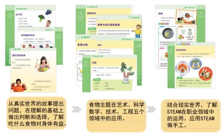 技能铅笔刀的八个主题,就用的是这种项目式跨学科活动的编排理念,横向跨越不同的学科和专业领域。比如STEAM 学前启蒙《健康的选择》这个单元,它的目标是让孩子认识食物,学会选择健康的食物。