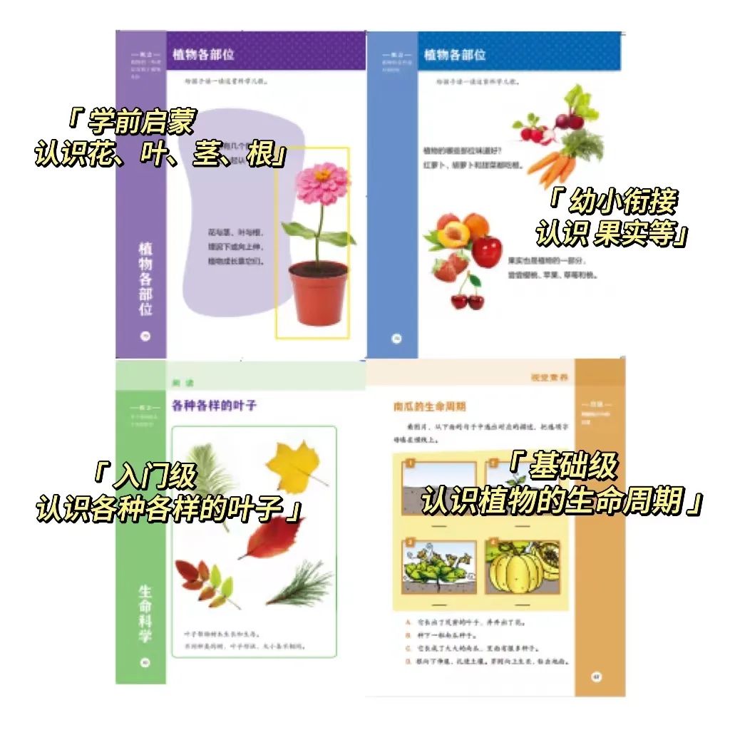 ★四个级别的内容互相关联,难度节节拔高,注重知识的复现。比如“科学”里学习植物,从“学前启蒙”认识植物的“花、叶、茎、根”开始,逐渐拓展加深认知,最后认识植物的整个生命周期。