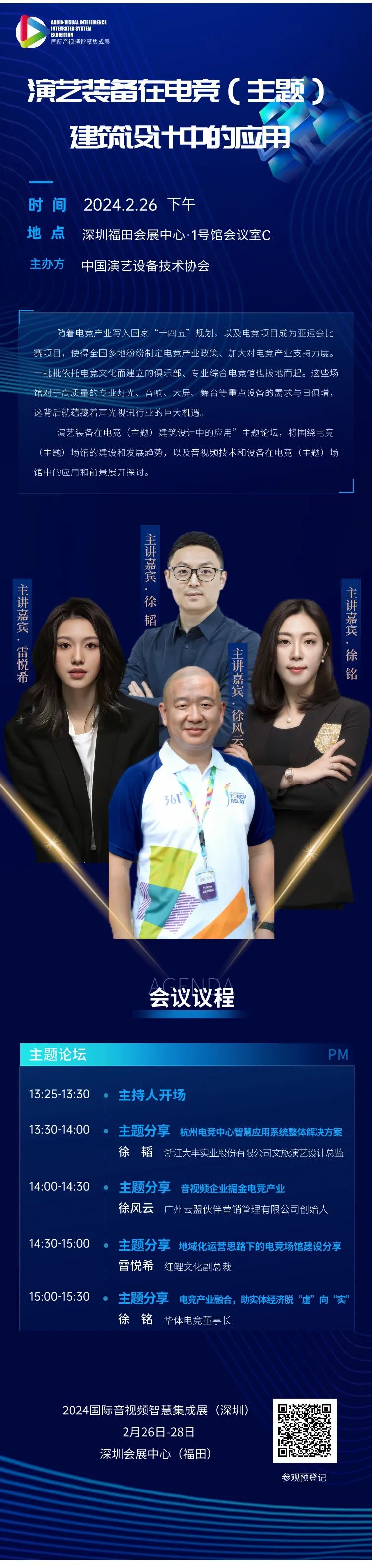 2月26日下午,展会组委会将举办“演艺装备在电竞(主题)建筑设计中的应用”主题论坛,届时嘉宾将围绕电竞(主题)场馆的建设和发展趋势,以及音视频技术和设备在电竞(主题)场馆中的应用和前景展开探讨。