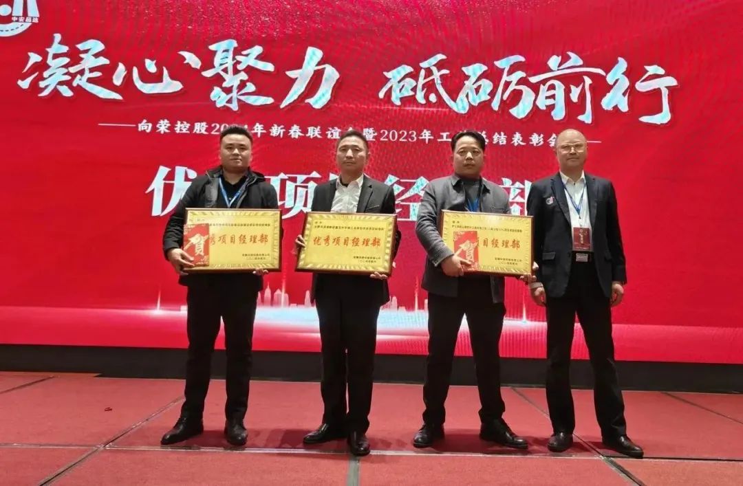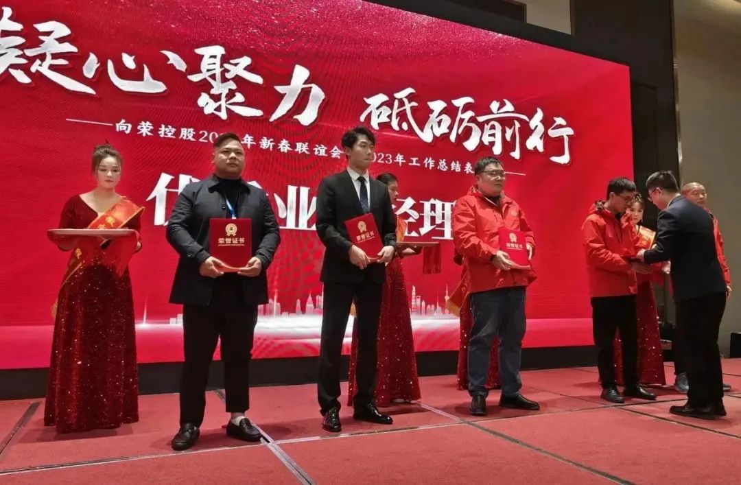 年会现场举行了热烈的表彰活动,表彰褒奖2023年为向荣高质量发展做出杰出贡献的优秀供应商、优秀业务经理、优秀项目经理部,优秀部门、先进集体、先进个人。
