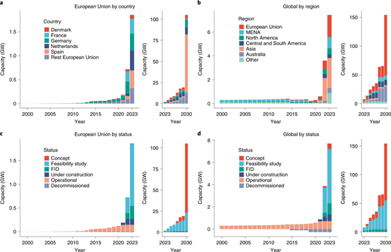 有鉴于此,德国波茨坦气候影响研究所(The Potsdam Institute for Climate Impact Research, PIK)Falko Ueckerdt等报道发现,虽然目前电化学分解的增长容量与风能/太阳能的增长速度类似,但是短期内绿氢的供应仍非常缺乏,而且长期来看绿氢的供应前景不确定。