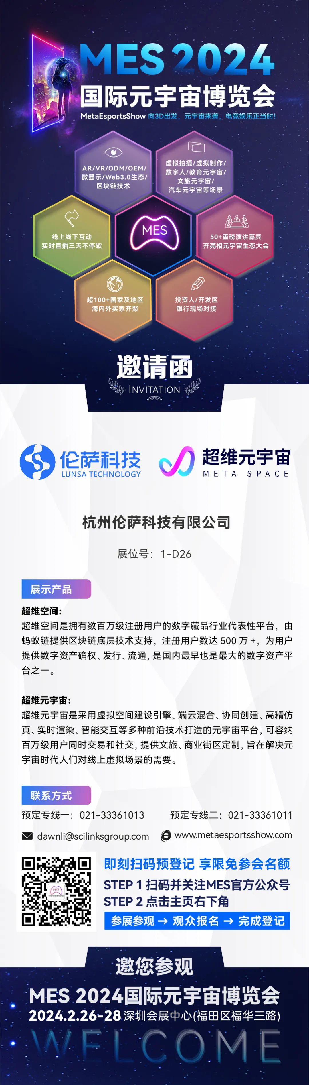 MES 2024元宇宙博览会明日启程,此次元宇宙博览会汇集了行业龙头和产业链标杆企业、VR/AR、数字人、web3生态应用,将一起探讨和展示元宇宙技术的最新进展和未来趋势。超维元宇宙曾获得杭州市2023“数字科技十大产业应用场景”在这次展会上我们带来最新的元宇宙场景及技术应用。敬请期待!