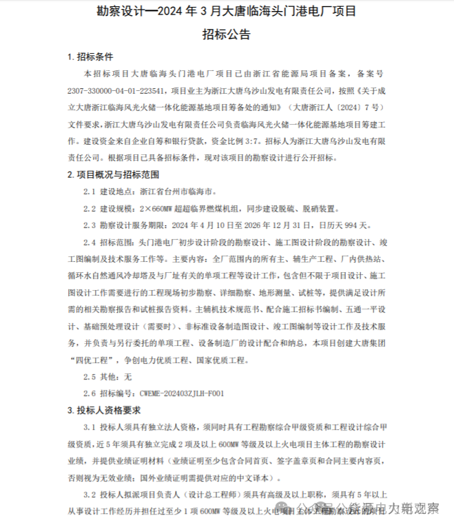 能源电力新观察获悉:近日,中国大唐集团有限公司大唐电子商务平台发布【勘察设计-2024年3月大唐临海头门港电厂项目】招标公告,大唐临海头门港电厂项目位于浙江省台州市临海市,拟建设2×660MW超超临界高效清洁燃煤机组,总占地约1000亩,总投资约70亿元。本项目创建大唐集团“四优工程”,争创电力优质工程、国家优质工程。
