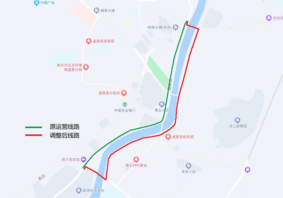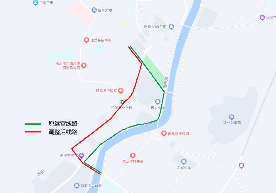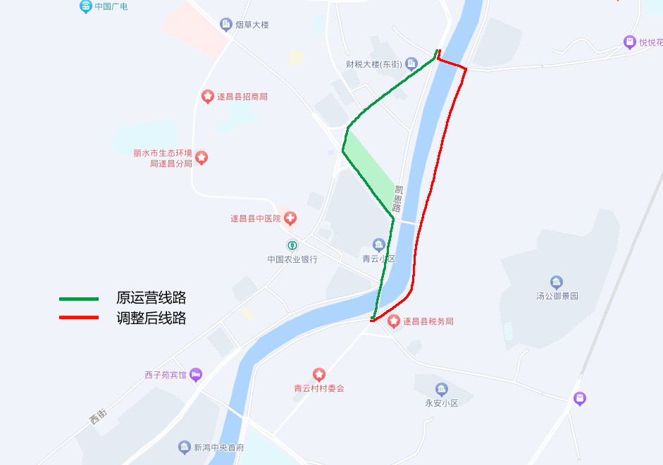 11路A、B环线停运路段为:凯恩路(西街十三弄口至平昌广场)、青云路。期间:南熏亭、南溪家园、平昌广场(西)站点暂停停靠。改道运营线路为:经西街、南街之后按运营线路运营。经停站台:教堂、公园路口、青云小区站点。