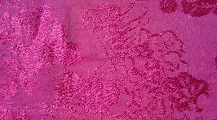 面料特点:经面缎纹花光亮华丽,地部略有细皱纹,光泽柔和,色彩丰富,手感柔软。