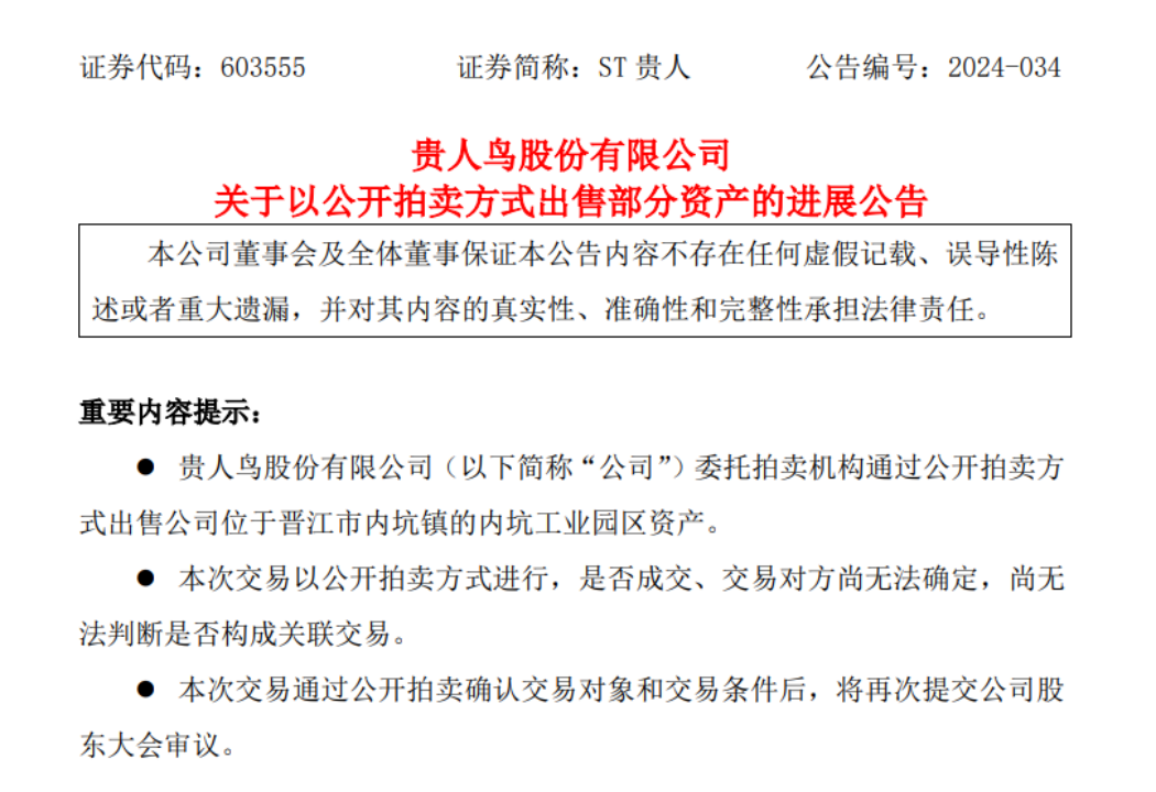 2月22日,ST贵人发布公告称,因涉嫌信披违法违规,公司及实控人均于当日被证监会立案。2月22日晚间,贵人鸟股份有限公司董事会发布公告称,公司及公司实际控制人、董事长李志华于同日收到中国证监会下发的《立案告知书》。因涉嫌信息披露违法违规,根据《中华人民共和国证券法》 《中华人民共和国行政处罚法》等法律法规,中国证监会决定对公司和李志华立案。据了解,李志华于2022年8月当选公司新任董事长;2023年3月兼任公司总经理;今年2月辞任总经理后,仍担任公司董事长。ST贵人表示,截至公告披露日,公司生产经营正常。立案调查期间,公司、李志华将积极配合中国证监会的相关工作,并严格按照相关法律法规的规定和监管要求及时履行信息披露义务。同日,ST贵人还公告了出售部分资产的进展情况。2月初,公司曾表示将出售位于晋江市内坑镇的内坑工业园区资产(房屋建筑物、在建工程及土地使用权)。 据了解,公司将委托福建方圆拍卖有限公司通过公开拍卖方式出售前述资产,时间定于3月5日15时30分,拍卖地址为上海市闵行区浦江镇浦星公路797号1号楼会议室。起拍价为4.8亿元,竞买保证金为5000万元。ST贵人表示,本次交易以公开拍卖方式进行,是否成交、交易对方尚无法确定,尚无法判断是否构成关联交易。本次交易通过公开拍卖确认交易对象和交易条件后,将再次提交公司股东大会审议。从财报数据来看,近年来,ST贵人业绩波动较大,且处于持续亏损中。其中2018年至2020年合计归母净亏损超21亿元,2021年扭亏为盈后,2022年再次净亏损了941万元。去年9月,ST贵人曾发布公告称,鉴于运动鞋服业务自司法重整以来收入下降、持续亏损,市场竞争日趋激烈,公司将对运动鞋服业务进行优化调整,根据公司实际经营情况,通过包括但不限于授权许可、出售、租赁等方式进行“贵人鸟”“Prince”等品牌资产和其他各项运动鞋服相关资产的处置,并逐步退出运动鞋服业务。尽管如此,公司2023年业绩仍将出现亏损。根据业绩预告,期内归母净亏损预计为4.85亿元,扣非后净亏损预计为4.95亿元。对于业绩预亏的主要原因,ST贵人表示,其一,2023年市场有效需求不足,公司所处的粮食行业和运动鞋服行业市场竞争压力较大,经营业绩受到较大影响;其二,公司2023年度计提大额资产减值损失及信用减值损失,对公司本期净利润的影响约-3.55亿元。另一方面,ST贵人曾于2月初表示,经初步核算,2024年4月末,公司需要偿还的司法重整留债债务本息合计约2.1亿元,而截至目前,公司经营现金流难以满足偿还司法重整债务的需求。此外,尽管本周已连续4个交易日涨停,但ST贵人仍存在面值退市风险。根据风险提示公告,2月22日收盘,ST贵人每股报0.9元,自2月1日至2月22日已连续10个交易日每日股票收盘价低于1元。截至2023年9月末,ST贵人股东总户数为2.92万户。来源 | 中国基金报、网络、编辑 | 化纤邦,转载请注明出处