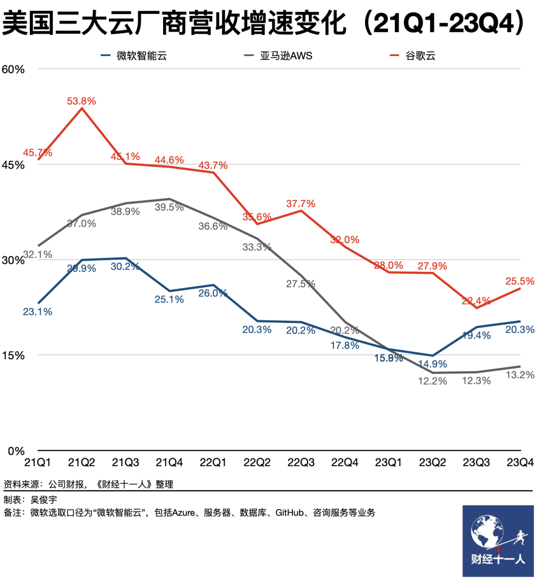 大模型让算力产业迎来了新的增长机会。中国云厂商普遍期待,大模型能让云市场摆脱过去2年多的低迷。不过,从财报数据看,美国云厂商吃到了第一波增长红利,中国云厂商暂时没吃到明显的增长红利。2023年下半年开始,美国云市场因大模型开始复苏。2023年微软智能云营收962.1亿美元,同比增长17.6%;亚马逊AWS营收907.5亿美元,同比增长13.4%;谷歌云营收330.9亿美元,同比增长25.9%。微软是其中表现最亮眼的一家。大模型技术带动下,2023年三季度、四季度,微软智能云营收增速还在不断攀升。亚马逊AWS、谷歌云营收增速略有回升。2023年中国云厂商的增长和大模型关系不大。2023年阿里云全年营收增速低于4%。天翼云、移动云2023年上半年营收增速超过50%。《财经十一人》多方了解到,2023年华为云营收增速为36%。天翼云、移动云主要受益于政企总包项目,华为云受益于混合云和数据库等PaaS产品。多位云厂商高管对《财经十一人》直言,一些客户只是从云厂商手里买了芯片、服务器等硬件。训模型、用模型进展有限,但这才能真正发挥大模型的价值。他们的判断是,随着商务谈判、落地交付逐步推进,2024年一季度后国内大模型商用案例才会批量出现。届时,大模型才会对云厂商产生业绩拉动作用。微软最早吃到了大模型红利。它一直是中国云厂商的学习对象。目前,微软形成了“云+软件+AI”三条轮动增长的曲线。微软的云业务,营收增速在20%-30%之间,毛利率约为60%;软件业务营收增速在40%-60%之间,毛利率高达80%;AI算力营收增速甚至超过100%。三条曲线构成了合力,其中云是资源和底座,软件会带来客户黏性、现金利润,AI会带动资源消耗、革新软件体验。一位华为云高管今年1月曾在一次小规模的媒体交流中表示,华为云无论是战略规划、市场调研都瞄准了微软。华为和微软有很多相似之处。微软长期扎根政府和大企业市场。微软除了Azure云服务,还有Power Platform开发平台、Dynamic开发平台、Office企业版、GitHub开源社区等一批著名的企业软件产品。他进一步解释,华为云也有一批“尖刀产品”,包括昇腾AI算力、大模型、数据库、软件开发生产线、大数据、云办公、云安全等。中国市场,只卖云资源已经没办法打动客户。为政府、金融、制造、能源等行业匹配“尖刀产品”才能奏效。