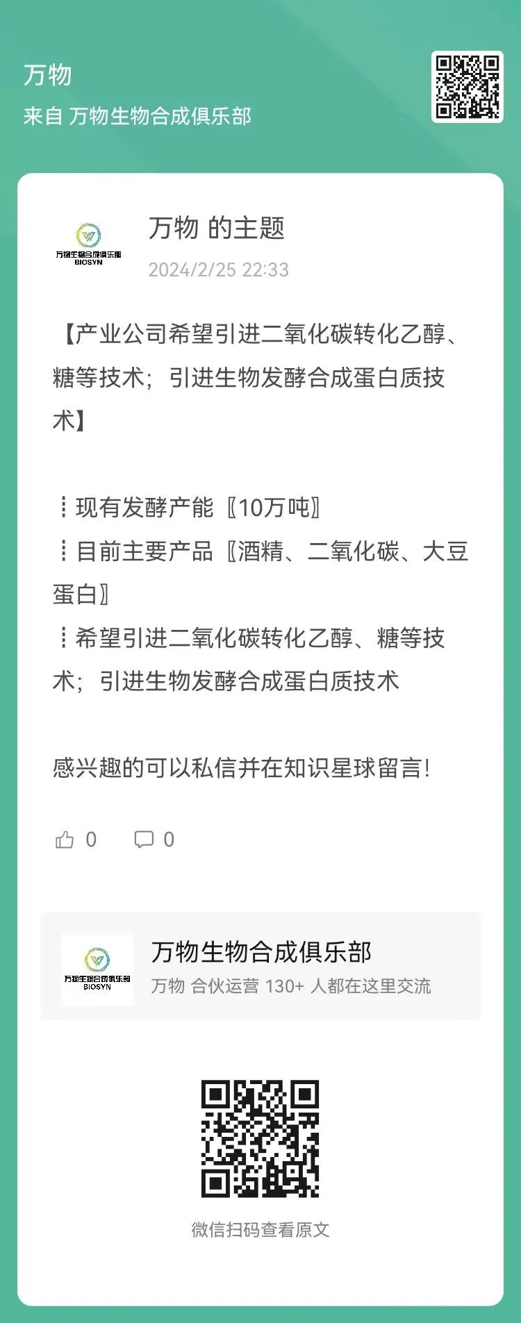 【产业公司引进合成生物项目】现有发酵产能10万吨,迫切引进二氧化碳制造酒精、糖等技术