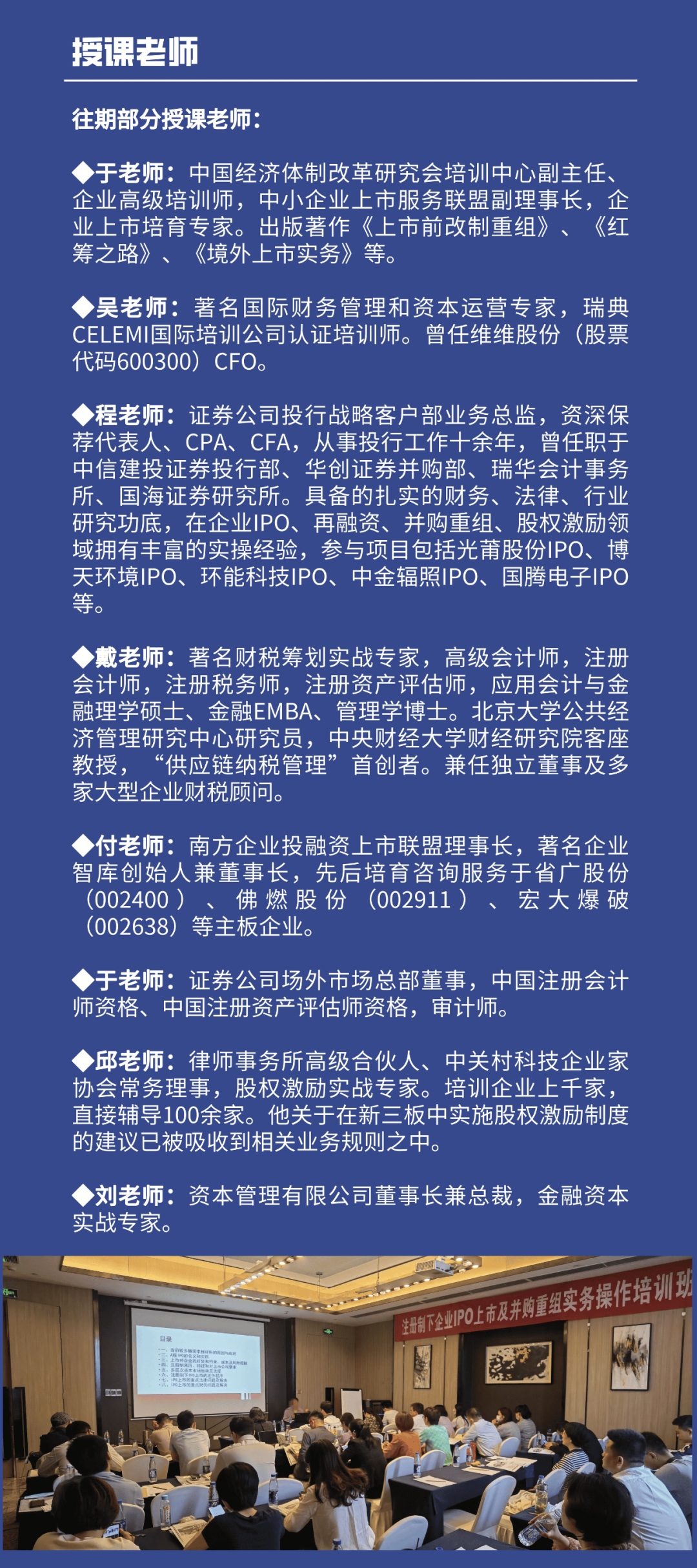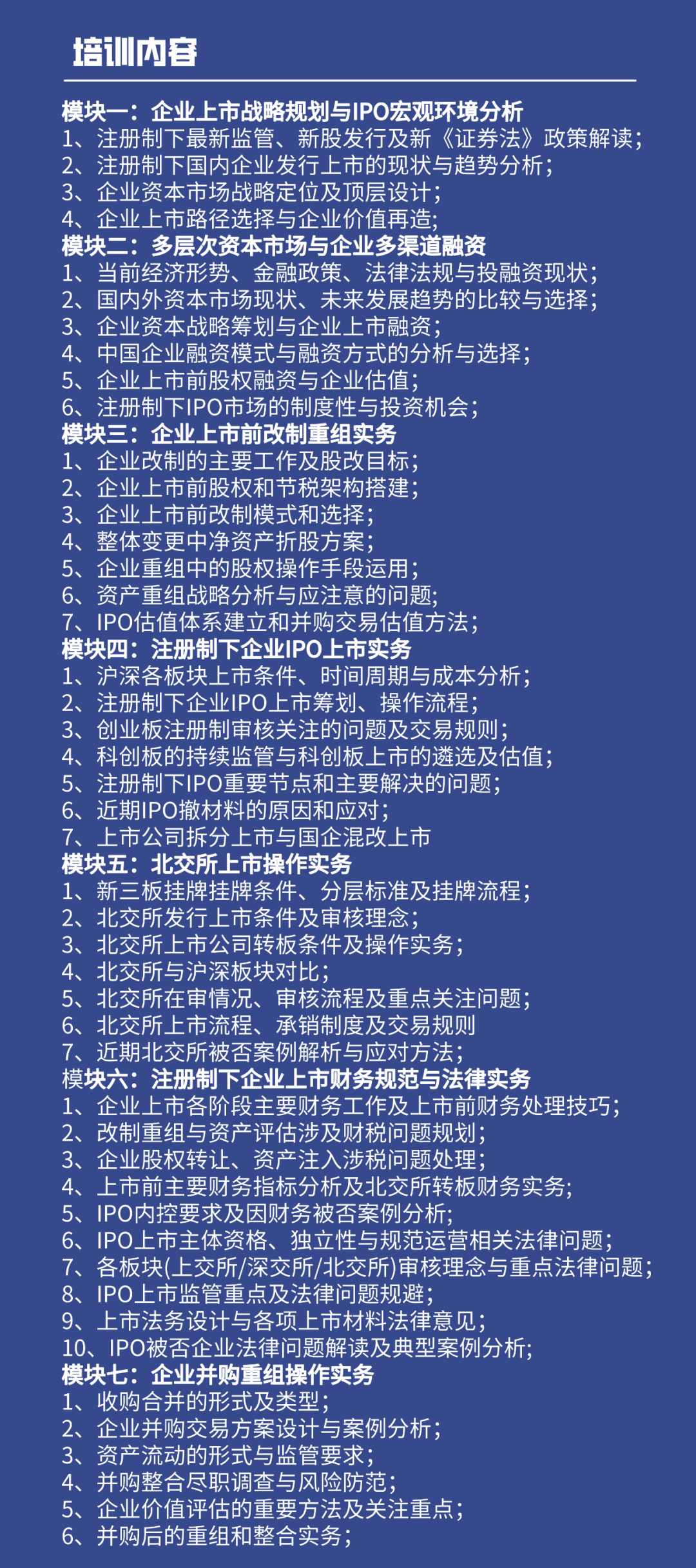 为帮助企业及相关机构全面了解我国资本市场的最新政策,加快培育高新技术企业、战略新兴产业、特色产业骨干企业、专精特新小巨人等中小企业上市进度,掌握注册制下企业发行上市、北交所IPO、新三板挂牌等重点难点问题,使企业更加有效的利用资本市场,拓宽企业融资渠道,制定企业最佳上市挂牌方案和融资方案,提升企业上市融资能力,促进中小企业转型升级和创新发展。中融商学院每月在全国举办“注册制下企业IPO北交所上市及并购重组实务操作研修班”。