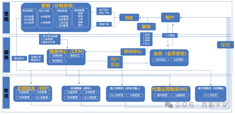 围绕消费者需求,形成以消费者为中心的端到端服务解决方案。依托分销平台,整合电商、零售、工程等销售渠道,与CRM系统深度结合,协同ERP等系统,运用大数据、VR等技术,打通实体、电商、工程、总部物流、售后服务、结算会计和物流配送等业务环节,推动业务在线化,实现精准营销,提高营销服务效果,增强客户体验,强化市场分析能力,增强消费者和企业的黏度。